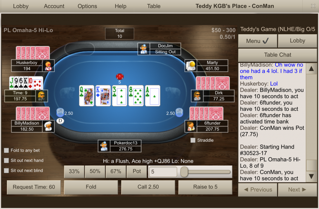 Double rebuy option added to rebuy tournaments. In rebuy tournaments, you can rebuy when your chips are at or below the starting chip level. Previously when a player lost all of their chips, they were presented with "Leave" and "Rebuy" buttons. Since that brought them back to their starting level, they could immediately perform another rebuy using the table menu. Now they are presented with "Leave", "Rebuy", and "Double Rebuy" buttons, which eliminates that second step if they choose.