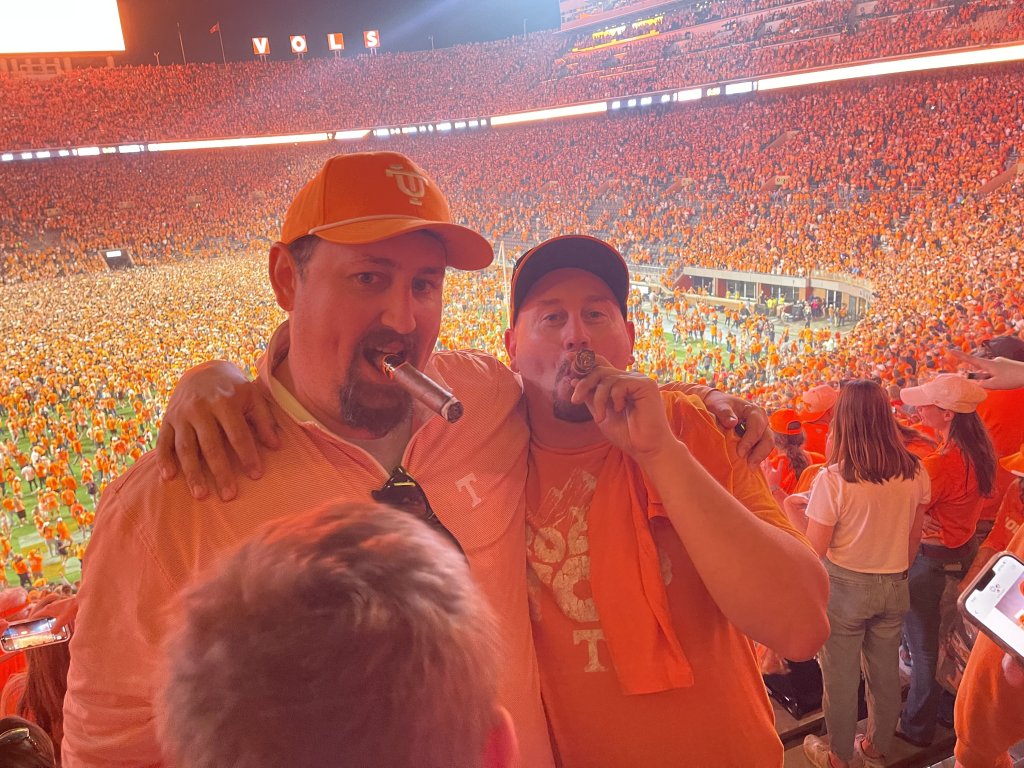 Ran into my old friend who owns Amendola Family cigars at Angus Barn. He gave me and my friends some sticks. Amendola Maduro. It's quite good. Nice pepper right off the bat. That's Jeff Amendola on my right with the surf n turf.