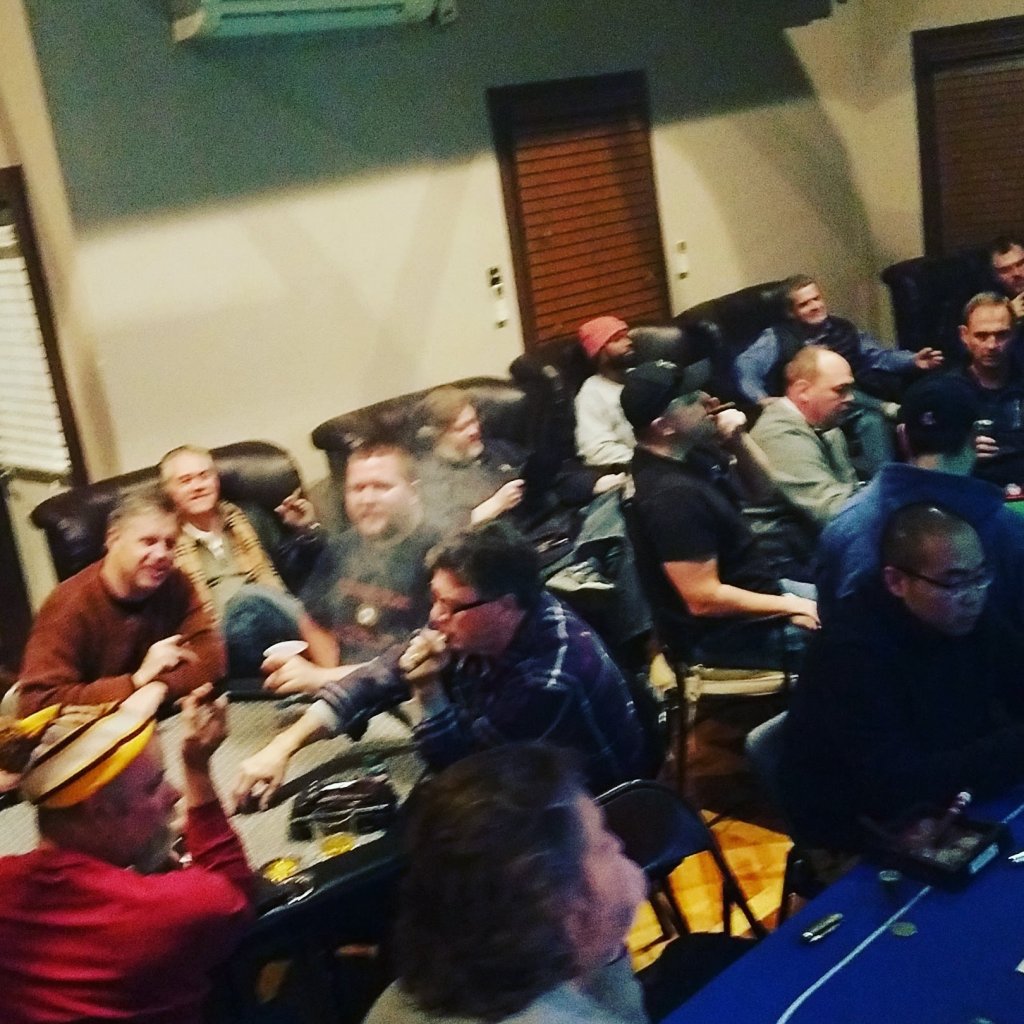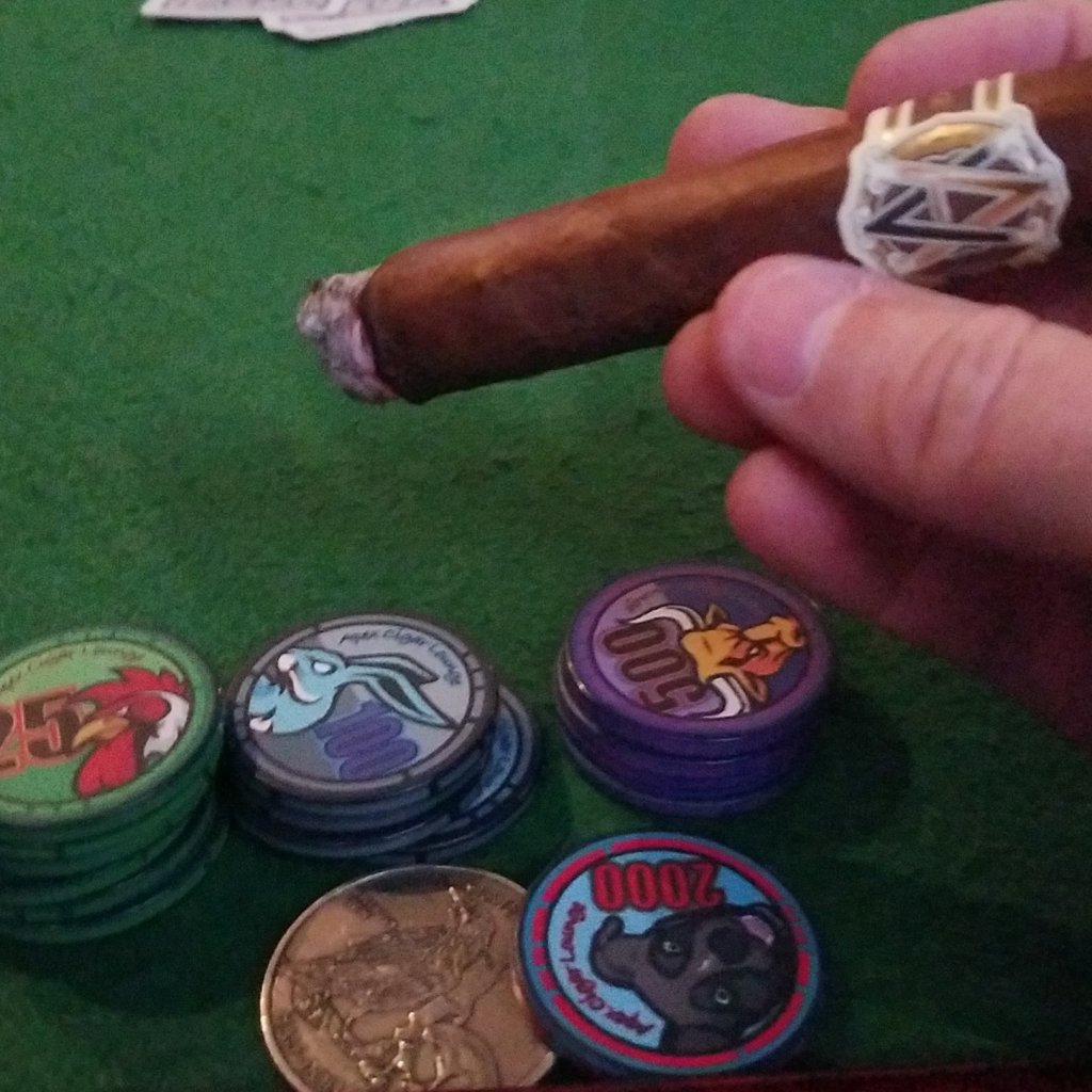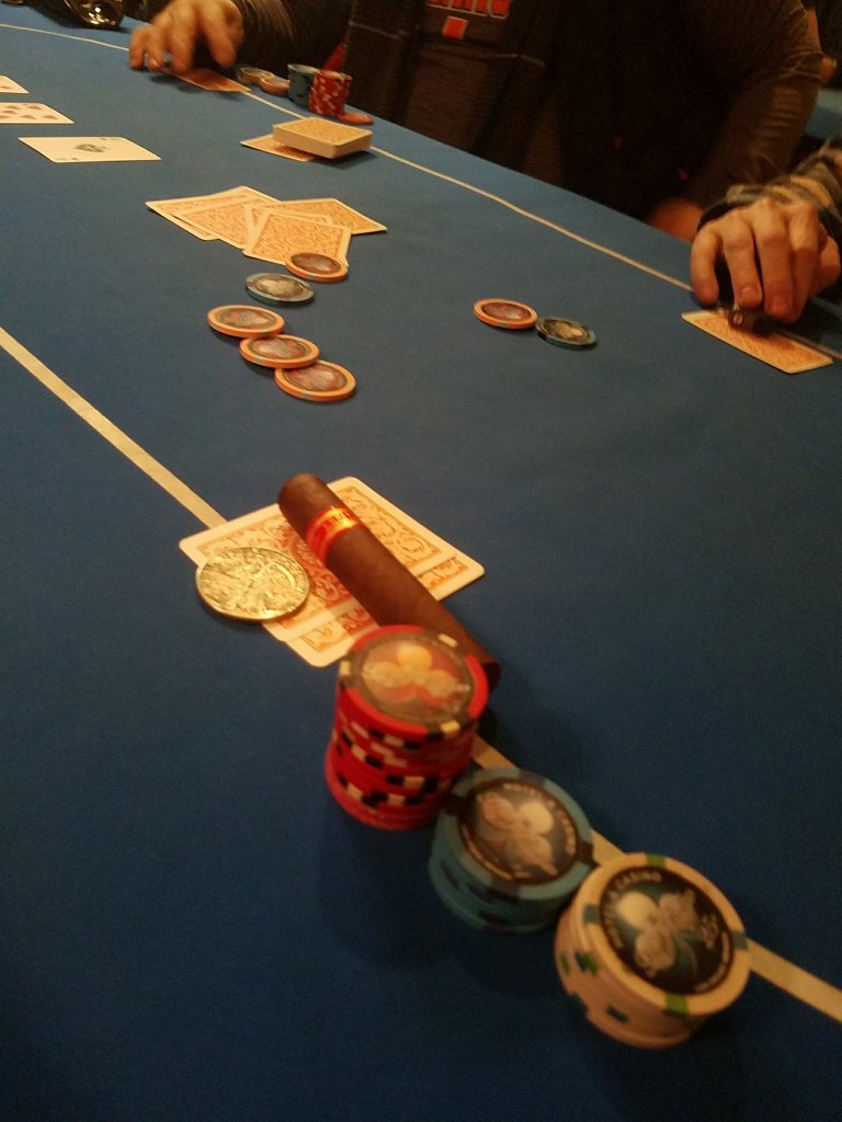 Epic night, 3 table tournament at the cigar shop. We had 23 players, 33 buys total. I struggled the whole night and at one point was down to 1100 of my original 5k. Came back and made the final table. Payout to 5 places. Hung on pass the bubble short stack. Came back to become chip leader at the forced chop at midnight for 1st place. Not an easy win but a very satisfying one.