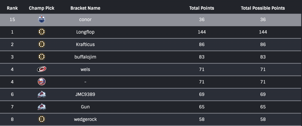 I believe I was team #4 with the Islanders winning the cup. Horvat just didn't come through for me. My bracket never seem to cooperate, couldn't get my name in there or anything. Not too sure how I ranked so high considering my West picks were a complete bust.