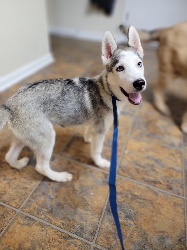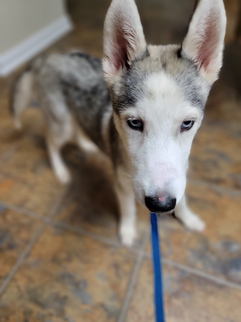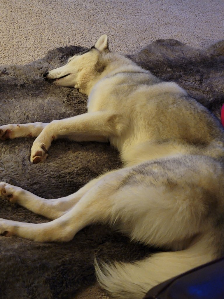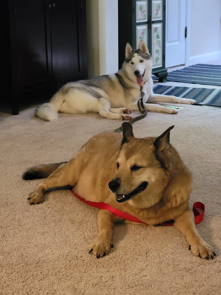Finnegan is a year old now, still in the velociraptor stage for a couple more years. He is taller and longer than Lucky, but since he is constructed of crack and meth, he is skinny! Why oh why did she have to pick the Husky at the shelter? We have just gone through his first real shedding. It was snowing in July inside my house.