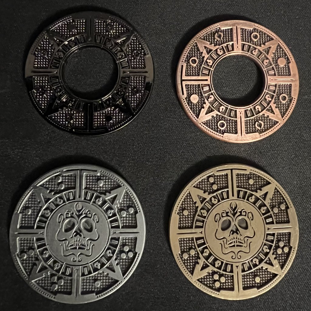 1. I feel like the single biggest problem with these chips is that the four different types all look fairly similar to one another. There are the copper and gunmetal chips that have holes in the center, and then there are the gold and silver chips that have skulls in the center. But other than that they are basically all the exact same design. Yes they are technically four different colors, that's true of course. But those four colors aren't really radically different from each other like say white, red, blue, green, pink, etc. would be. Instead, these four are all fairly muted metallic colors and unfortunately they kind of all blend together in low lighting situations such that the two chips with holes become easy to mistake for each other and the two chips with skulls become easy to mistake for each other. I mean there is a darn good reason that standard poker sets differentiate between their various chips in multiple ways by coming in different colors, having differing edgespots, having denominations printed on them, and sometimes even having different artwork and/or label shapes on each chip (like Pharaoh's chips). But with these pirate chips it's really just center hole versus center skull and slightly different colors of metal. So if someone splashes the pot and chips go everywhere then you are going to have to pay very close attention to figure out what stakes are on the table.