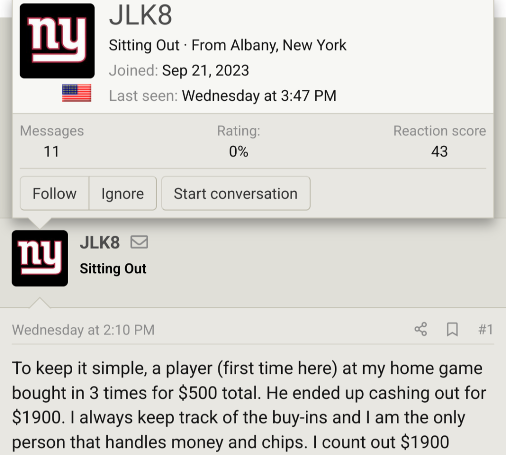 Agreed. My point is, maybe he thought he was short $500 because he forgot about one of the buyins. That seems more likely than making a $500 counting error, twice, or losing/dropping/misplacing $500.I don’t care how much he bought in for, only his chip count at cash out matters. Chip count equals stack count, you’re all good. He had $1900 chips at cash out who gives a crap how much he bought in for.