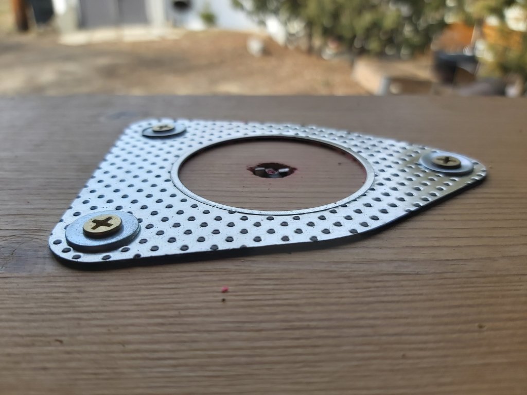 4) Take your 2" ID exhaust flange and place it so the fender washer fits snugly inside. Fix it down tight to the board by drilling through the guide holes and fastening the whole thing down with a pair of appropriately sized bolts/nuts/washers. The jig is now complete.