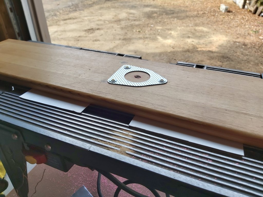 5) Take out the drill bit, but leave the washer inside the exhaust flange. Line up the jig with your 3/8" undermounted router bit so that it goes through the hole of the fender washer. It should now be just about perfectly centered. Fix your router edge guide to the edge of the jig.