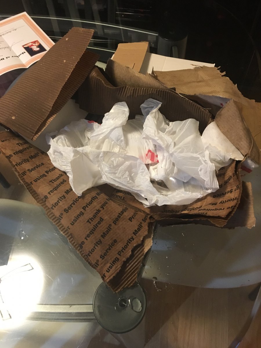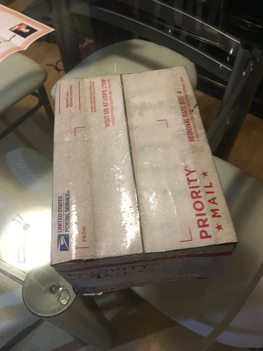 He then proceeded to tape the ever-living shit out of it with "Priority Express International" logo shipping tape, to the point you couldn't even tell what kind of box it was originally.