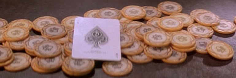 Zooming in on this photo, the far left octagon, it reads "Crystal Palace" and "$1". So maybe these are tokens and not bullion?Earlier in the movie, he plays a cash game and they are using red, white, blue (classic plain paranoids or bakelites) plus what look like bullion in gold (triangles) and silver (octagons and squares). Here is a clear shot: