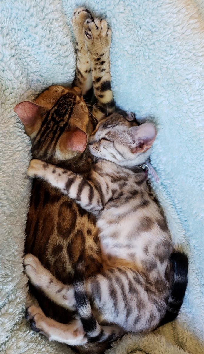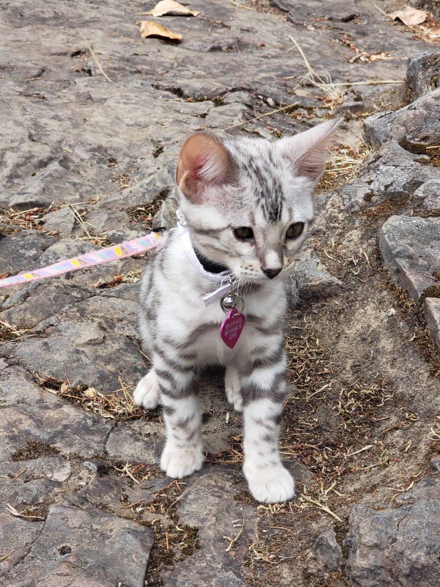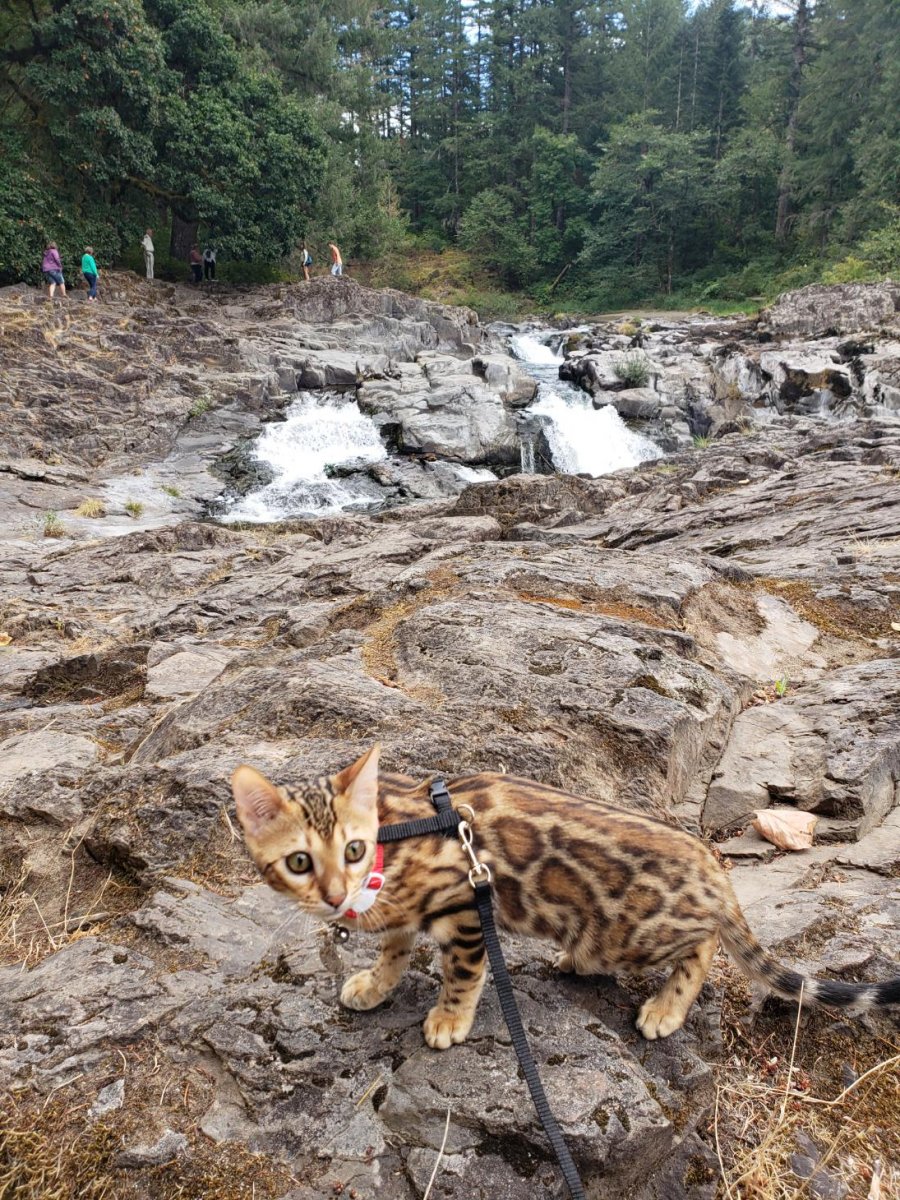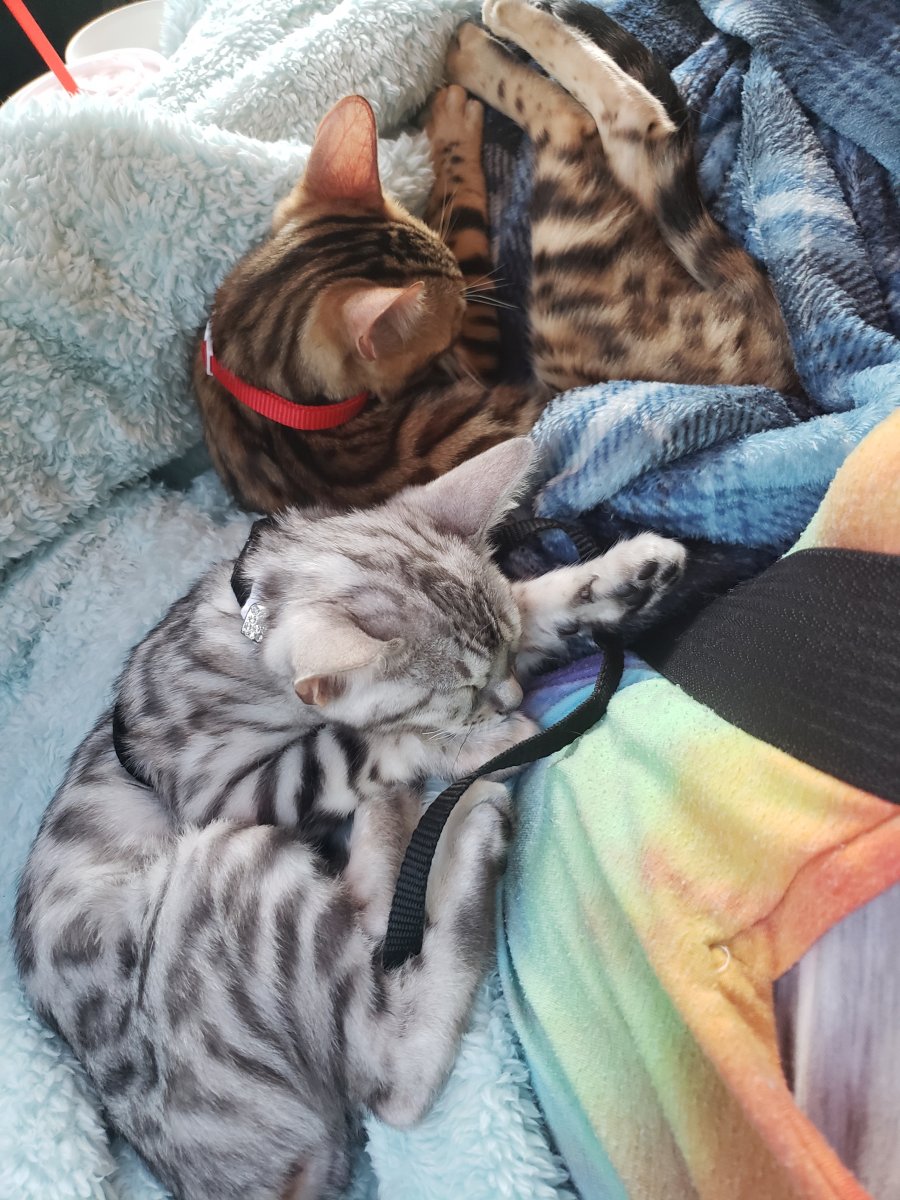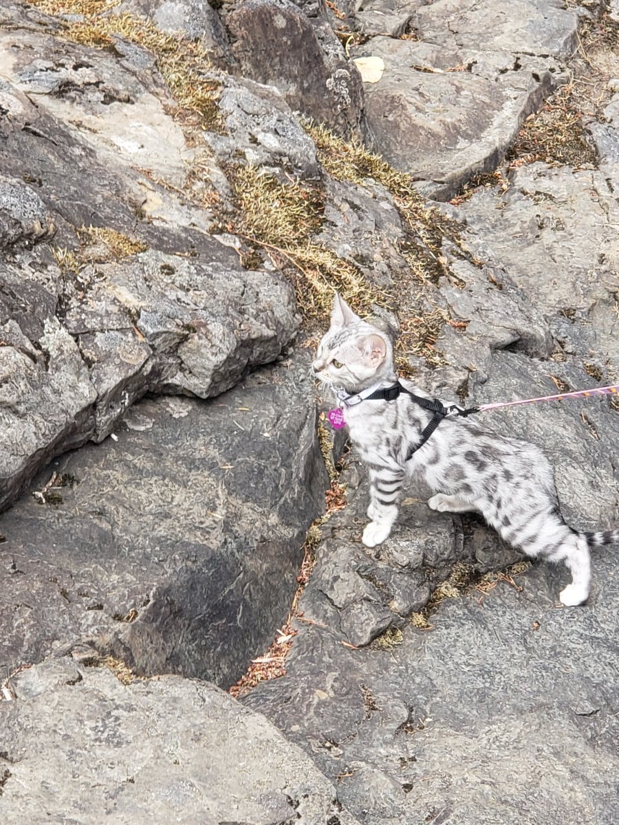 Two Bengal kittens. One orange and one silver. Also rehomed an adult Devon rex. Went from one hairless cat for the last 12 years to a total of 4 cats in 3 weeks. Took the bengals for a hike!