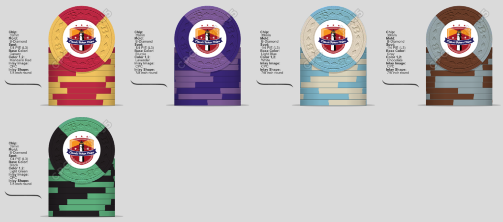 The in-progress chip on bottom row would be a no-denom, subbing as either a pink/red T5000/T10K tourney chip or white $100 cash chip (could even be used as a nickel).
