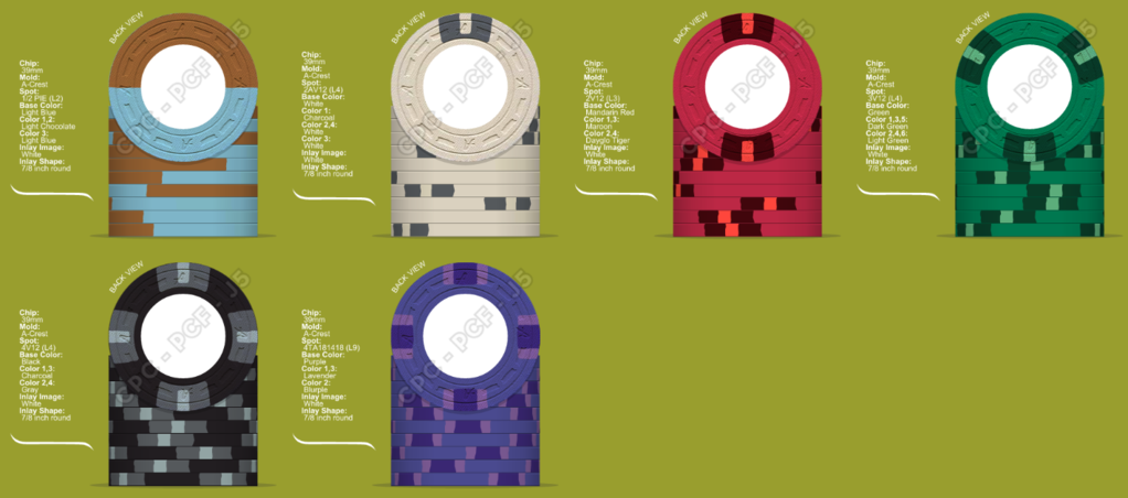 Here's one I threw together the other day, working on a dual-purpose set (tourney/cash with 25/100/500/2000 denominations). Quarter-pies that use vertical tournament colors (green/black/lavender/orange) and horizontal cali cash colors (chocolate/blue/yellow/charcoal). The in-progress chip on bottom row would be a no-denom, subbing as either a pink/red T5000/T10K tourney chip or white $100 cash chip (could even be used as a nickel).