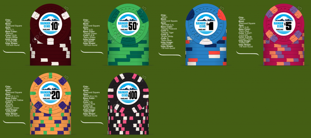 The $20 is perfectly fine as it is. Certainly don't swap out the Arc Yellow (you'll bite your ass if you ever see a Paradise LA $5 in person) and even the DG Green doesn't have to.Scott, you need more contrast (IMHO) on the following chips: