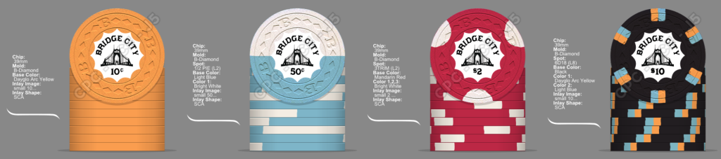 I’m not that concerned about it since they likely will never be made, but keeping the color theme is paramount to the purpose of the set. I honestly don’t believe there would be huge dirty stack issues with those 1s and 5s. But if I did, I would simply change the spots to 214 instead of 212.You cannot hope to make a 4-chip set using the same 4 or 5 colours among all base and edge spots without becoming a dirty stack nightmare. Use your main colours however you wish for the base, but vary the edge spot colours and patterns to make each chip distinct.