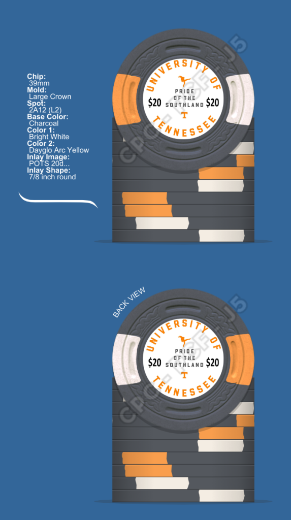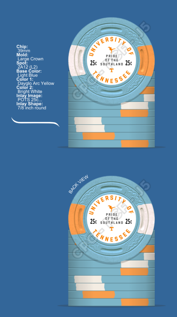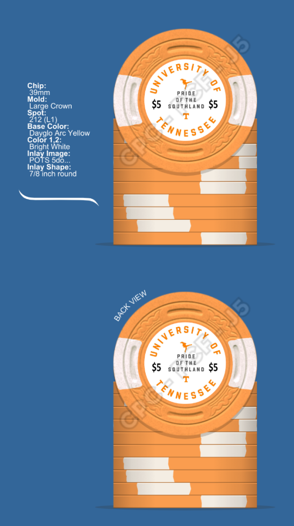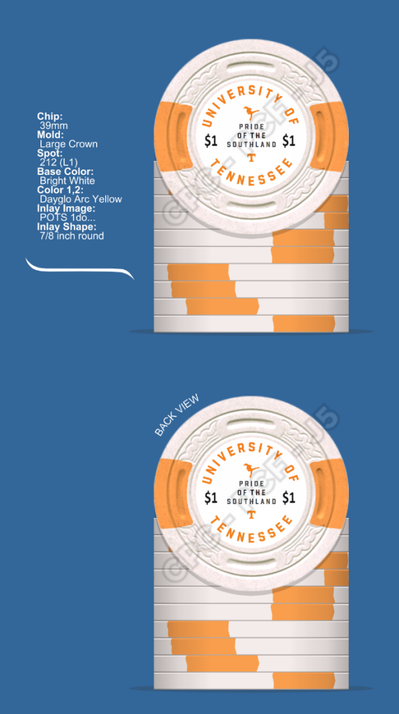 Dirty stack with the $1 and $5. Just press "All chips" instead of main chip.I worked these up for my son who is in the Pride of the Southland marching band. Not ‘normal’ colors in some sense, but designed to stay in the Tennessee palate. (The light blue would be consistent with the lady Vols and the dark gray would be ‘Smokey’). Have to post four separate pics because I can’t figure out how to make an account to create a project. Too bad the cost for actually producing this set is prohibitive.