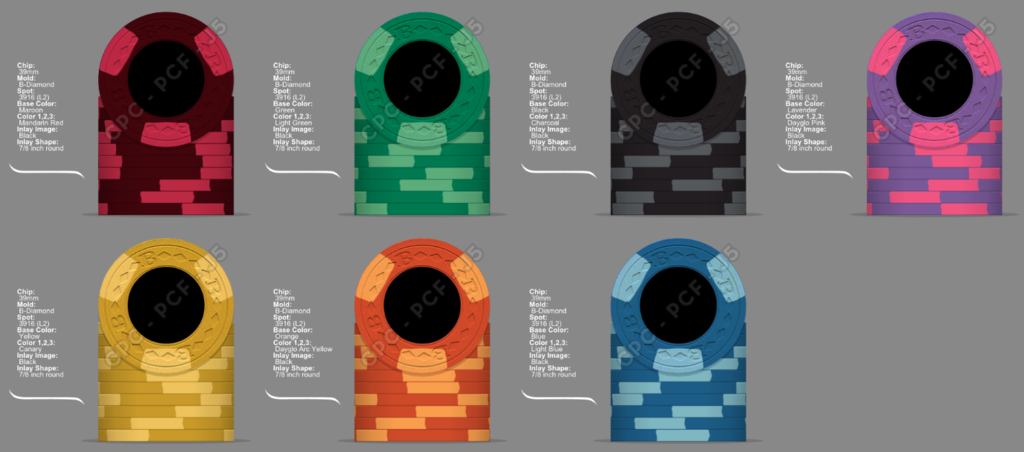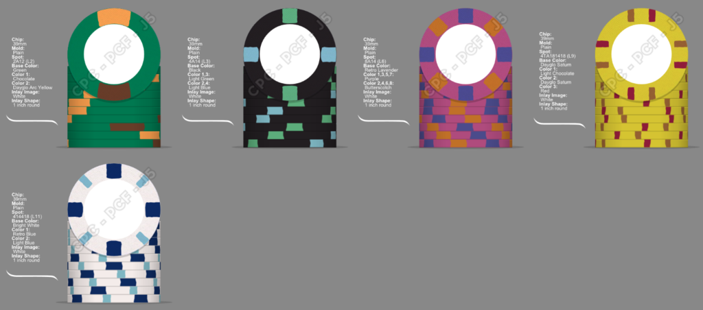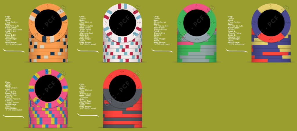 The chips are already made, the owner of them is doing a relable project. He has hired me to do artwork for them. With a program i just basically cut and paste the new labels over the top. Thus also giving a better perspective of the final look of the product. And these will be 7/8ths inlay -lables but i just like the look of the oversized IMPO. If you got any ideas that you might want to put into prototype, PM me and I'll see that you're concepts can become a virtual reality. ....thanks for looking