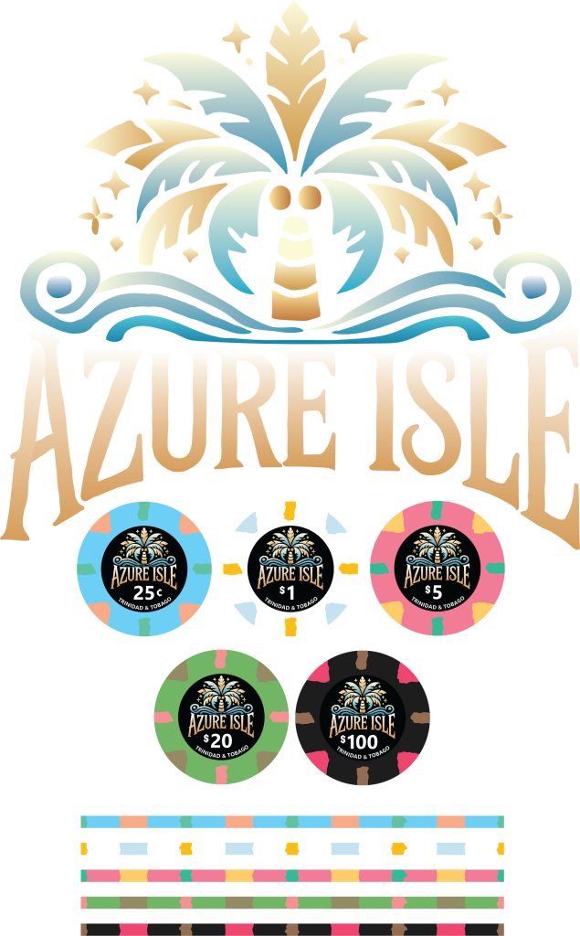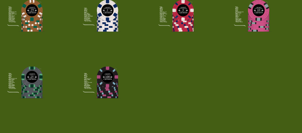My dive into poker chip obsession has just started, and I felt the urge to mockup a set that would suit the home game I currently play. We play .25/.25, $20 buy-in and we would never really use the $25 or $100 chips, but I had ideas enough for 6 chips rather than 4. I know that a Crown Casino set already exists out there, but I like the name and the idea for the inlay came from that.