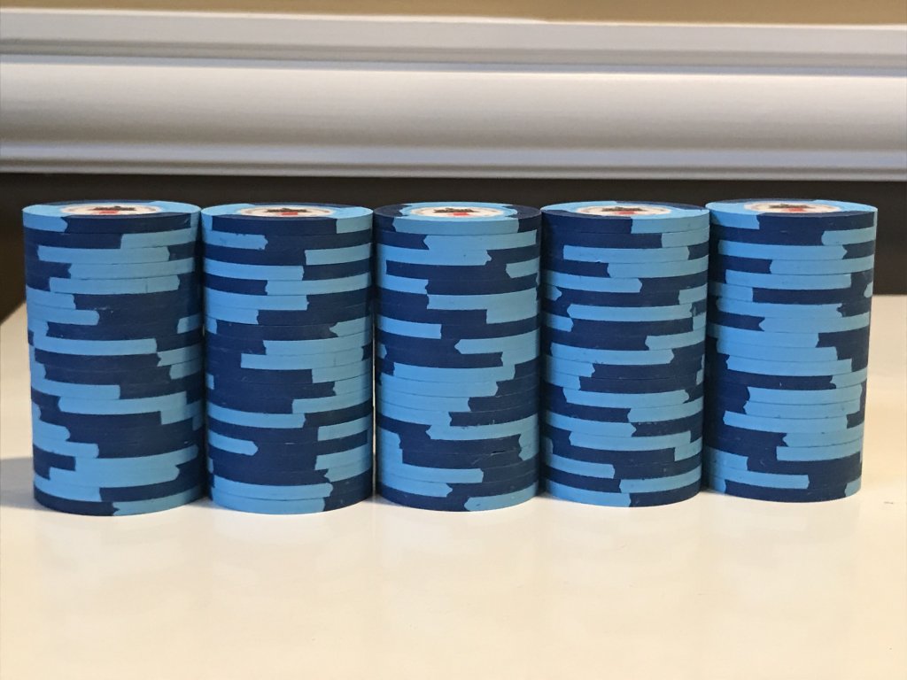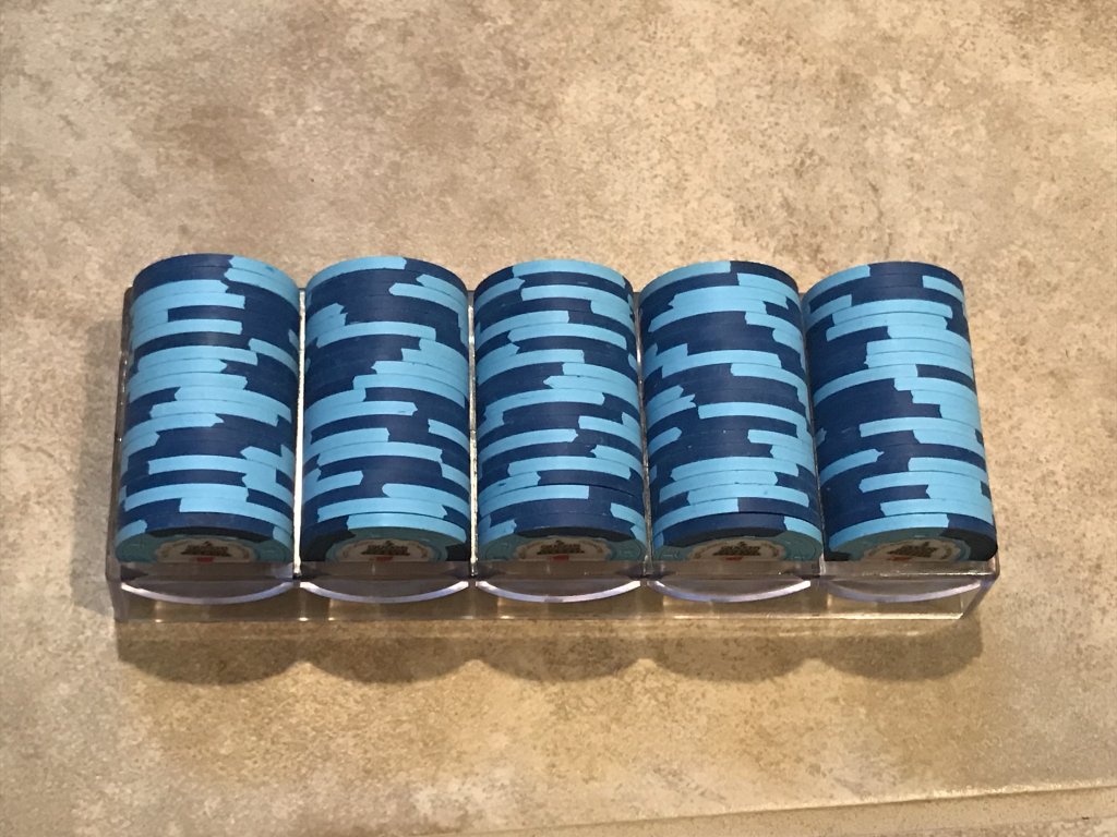Pictures alone don't do these chips enough justice. The blue on blue spotting blurs some of the finer details. I finally got a chance to handle these chips in person when @RocAFella1 showed up with a rack during the recent Bay Area meetup. I was mesmerized by their weight & feel, they're just a joy to stack n shuffle.
