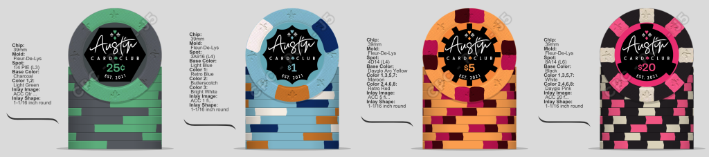Note to self… cancel sample set for @TX_Golf_N_PokerInlay is better, i.e. readable now. I liked the quarter, so glad you didn't change it other than rotating the label. The $1 edge spots got worse. You removed the one day-glo spot instead of adding more. The $5 got slightly better. Maybe... Still too dark. Pink > butterscotch on the $20. But regular white still a bad choice for an edge spot. Actually, CPC regular white is just a bad choice anywhere on a chip. It's not a good color. You know it has speckles (brass?) in it, right? And in time, they turn green. Use bright white on the $20 and some day-glo colors on the $1 and the $5 and you will thank us.