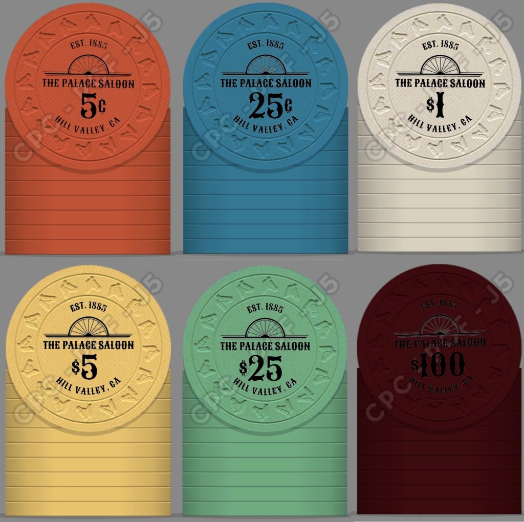 They have horses in Hill Valley?Ok, because I’m a crazy person I’ve decided I’m going to build a full Back To The Future trilogy chip set to go with the movie trilogy. Already have Biff Tannen’s Pleasure Paradise. @MrCatPants hates Lou’s Cafe (shocked face) and here is the first mock-up for The Palace Saloon from Part 3. This will be a gold hot stamp set.