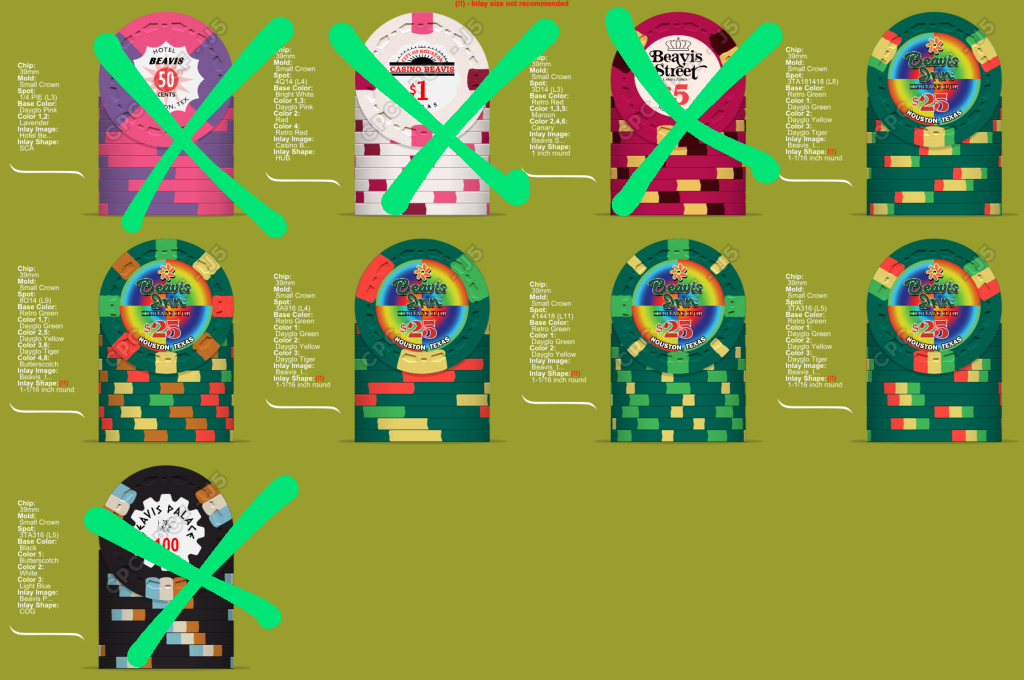 I like the sequence of green chips. I say cut the other colors and do a 5 green chip set. The spot patterns are different enough that I don't see dirty stack issues. Gives new meaning to Tesla's phrase "Taste the rainbow!"