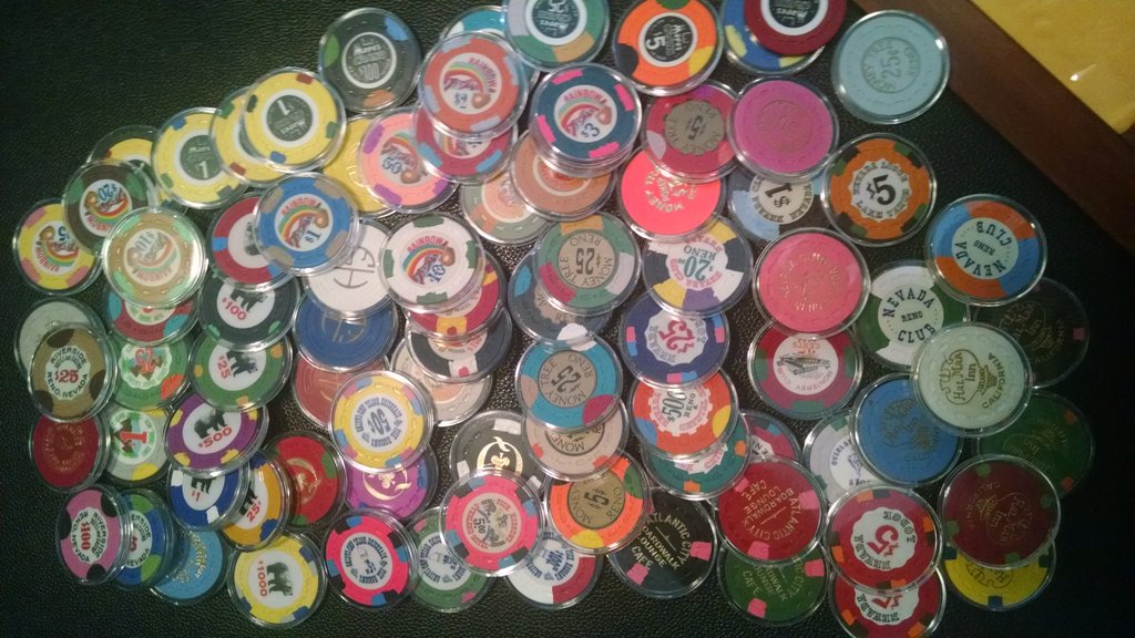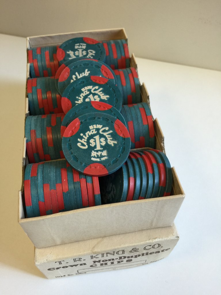 Well, I'm in the hunt again for hotstamped $1s for this set. The China Clubs just won't do. In keeping with the theme of the other denominations, the $1s need to be California card room hotstamps.Ok, ok. Here it is: vintage hotstamped TRK mixed cardroom/casino 10c/20c micro-stakes set.