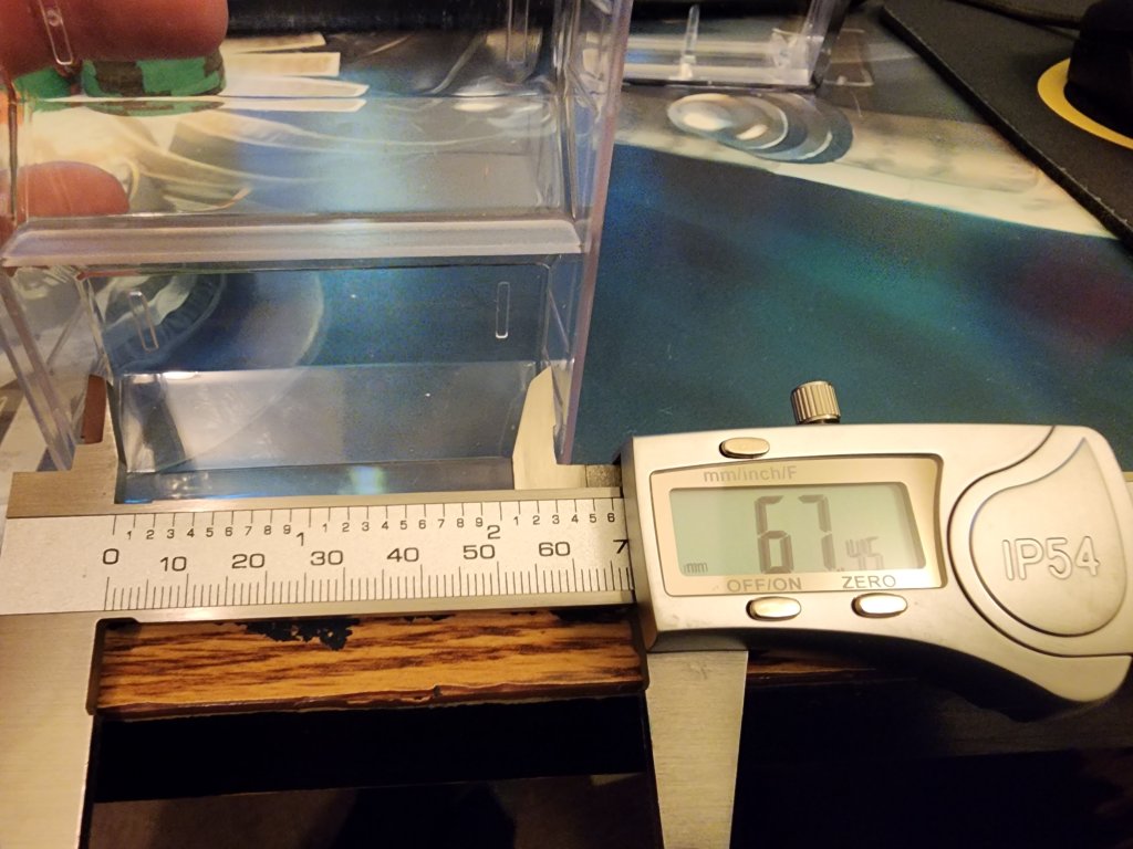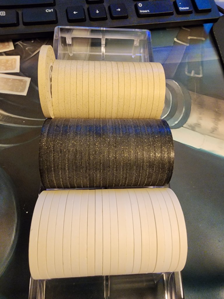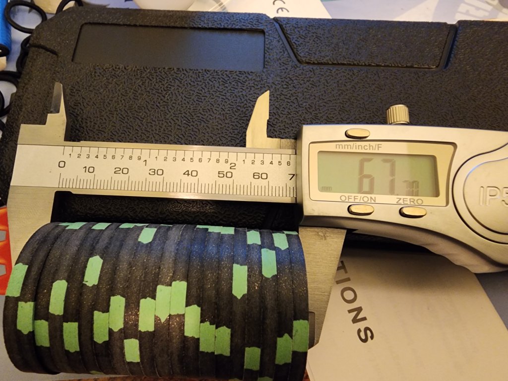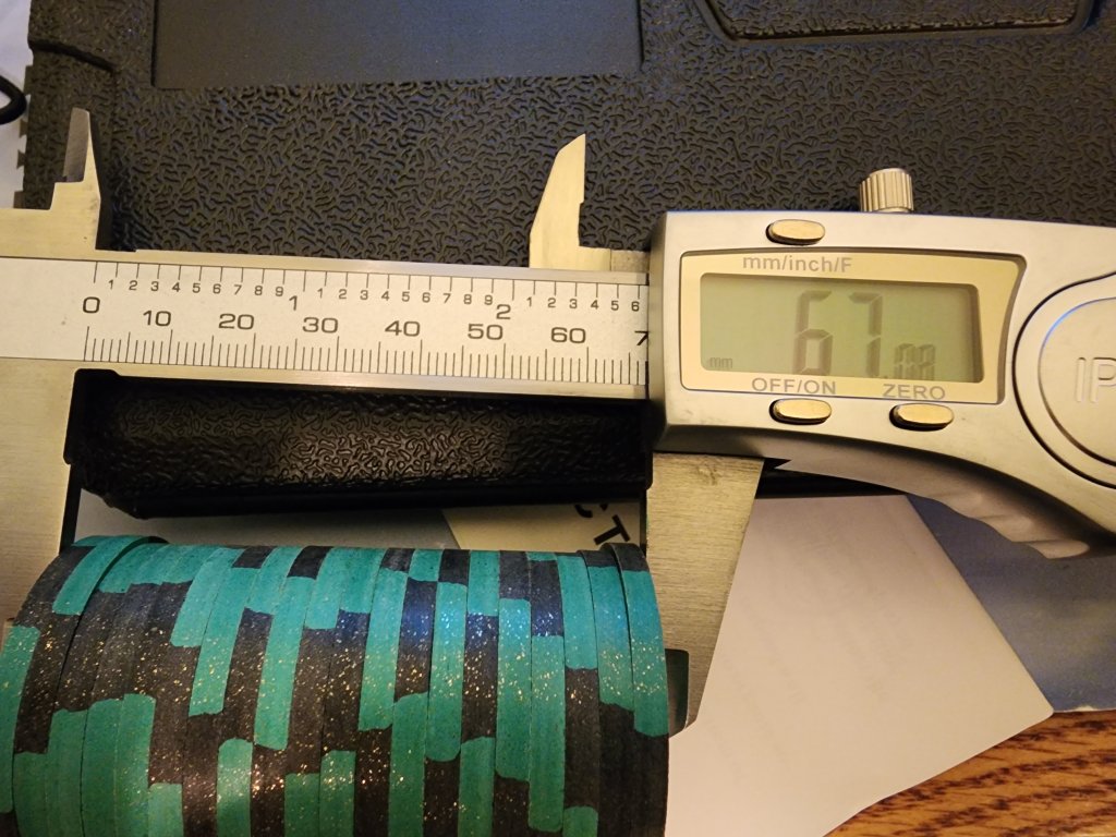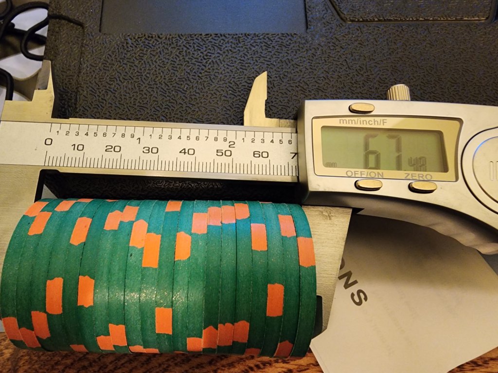 Many of my CPC rounders barrels were around 67.5 which fit ok, but depending on the color or an errant thicker chip, some barrels went over 68mm...which is far too wide.So here we go. Three different molds. Looks like the CSQ are thicker than the others CPCs I have. Added a minty barrel of white THCs and a paulson rack for comparison. The difference in the barrels between thicker CPC and THC is about 1.7 mm. The tolerance in the Justin racks may be why most CPCs don't fit. There's less than a tenth of a mm to work with. From my stock, looks like a 67.8 would do the trick (CSQ rounders 100 came in at 67.7, last photo). But this would leave the Paulsons with over a mm to wriggle around. Idk if we can hold that tolerance to a tenth for a CPC variant of the justin rack.![]()