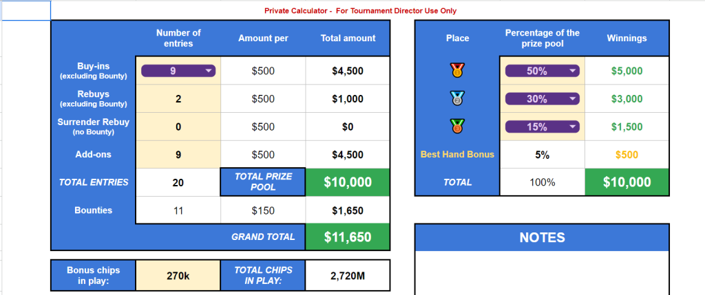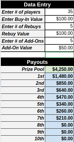 I've started making a payout calculator in Google Sheets. I've managed to fix the rounding error by adding or removing the difference from first place. Currently it will input buy-ins, rebuys and add-ons and allow you to enter a different amount of money for each one. It will keep the number of players the same based on the number of initial buy-ins. It's also capped at 50 players but that's easy enough to scale.
