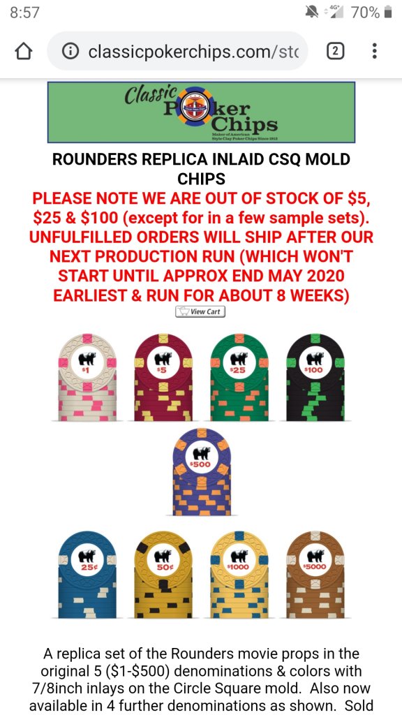 That message has been up there for about 3 months now. The Rounders CSQ mold is running right now, I placed an order back in mid-April and they are supposed to be delivered today. I just went with the stock setup. David said they had a huge number of orders come in but I don't know how many extra they are making.So is now a good time to place add-on orders for CSQ Stock Rounders chips? The website still says $5, $25, and $100s are Out of Stock.