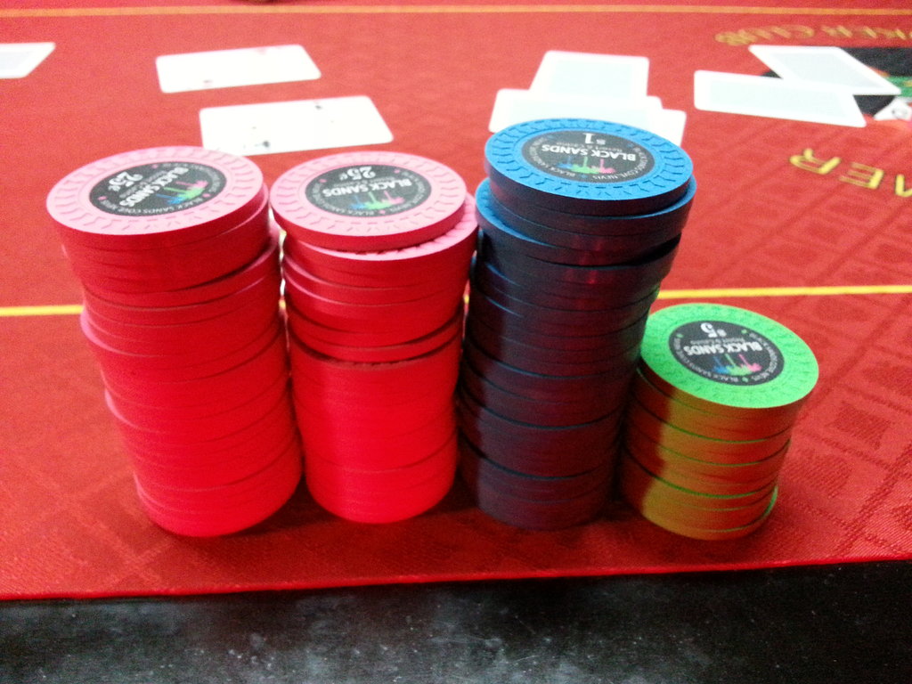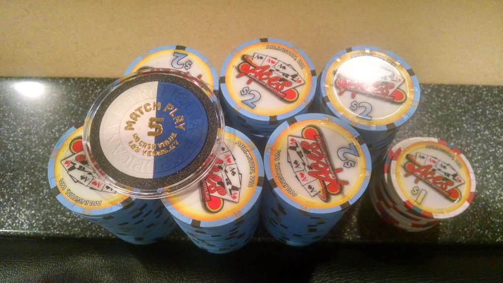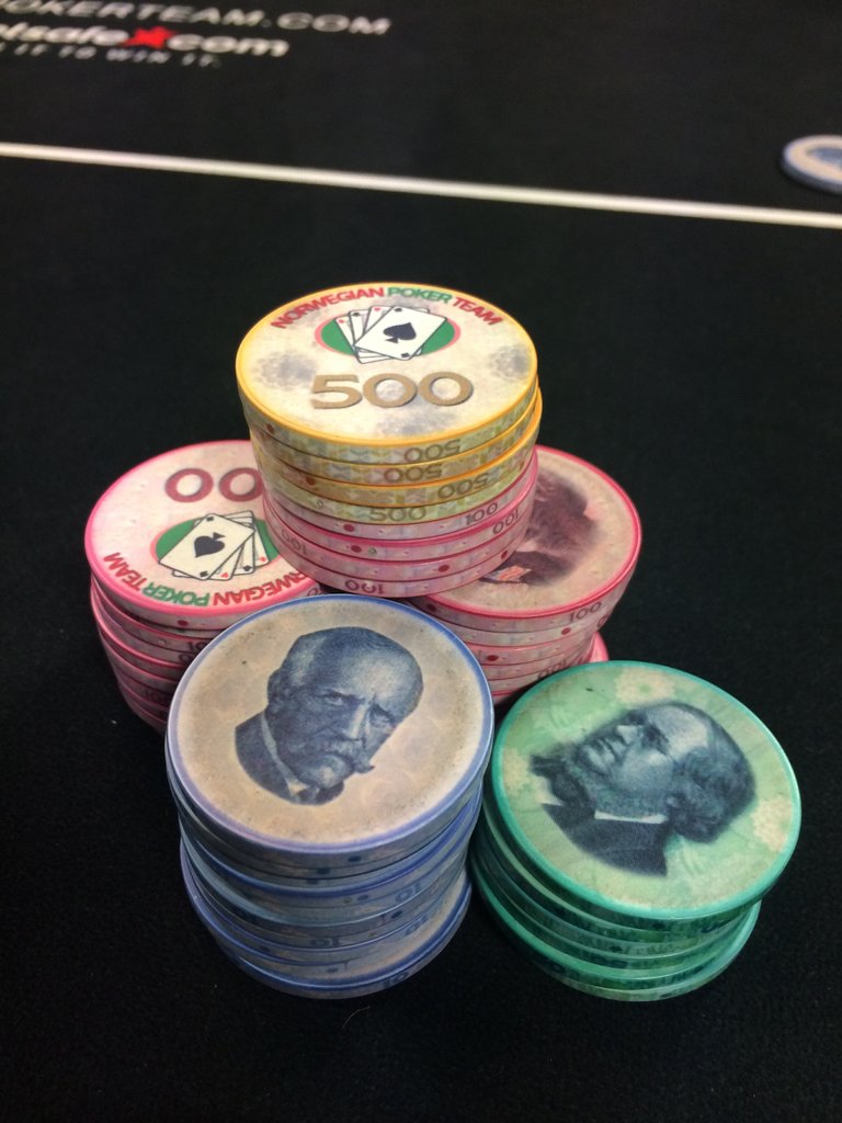 Not mine but Todd Brunson posts starting and ending stacks on twitter. He hasn't said what the values are but only cares that he gets "paid in $100 bills" and he leaves a game once he is up 1k. The best I can figure is the Pharoahs are $25, blue starbursts are $10 and the peach starburst are $5. Gives me new appreciation for mixed sets and non-denoms.