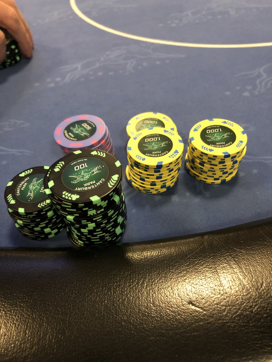 Blue and black chips are worth a $1, greens are $5 and reds are $10. The gold $5 stamp on the red chip is decoration. Around $385 when I snapped the picture, ($70 in cash.) Finished the night three handed with $416 out of $600 in play.