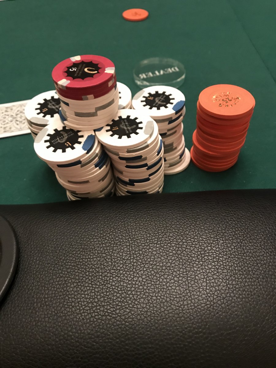 Local $1/$1 $40 buy-in game, 6 handed. Dice mold, casino weight chips. In for $155, which rarely happens. I bought in for $50 after losing $105. Told everyone at the table that was the end of the line for me. Chipped down to $7 and was dealt a strong Omaha hand facing a $5 pre-flop raise. Shipped it and tripled up.