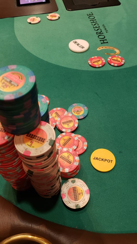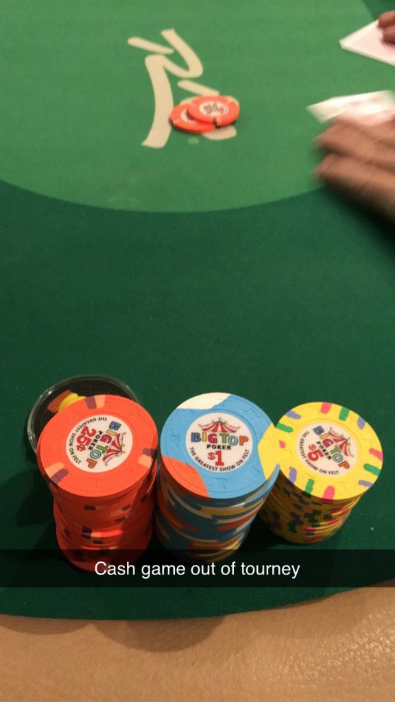 I forgot to take a picture of my final stack. In for $100, out for $106 after 10.5 hours. My stack progression looked like the heart rate monitor of a dead man. Couldn’t ever get anything going, totally card dead, and couldn’t hit a flip to save my life. Good times with the St. Jos though!