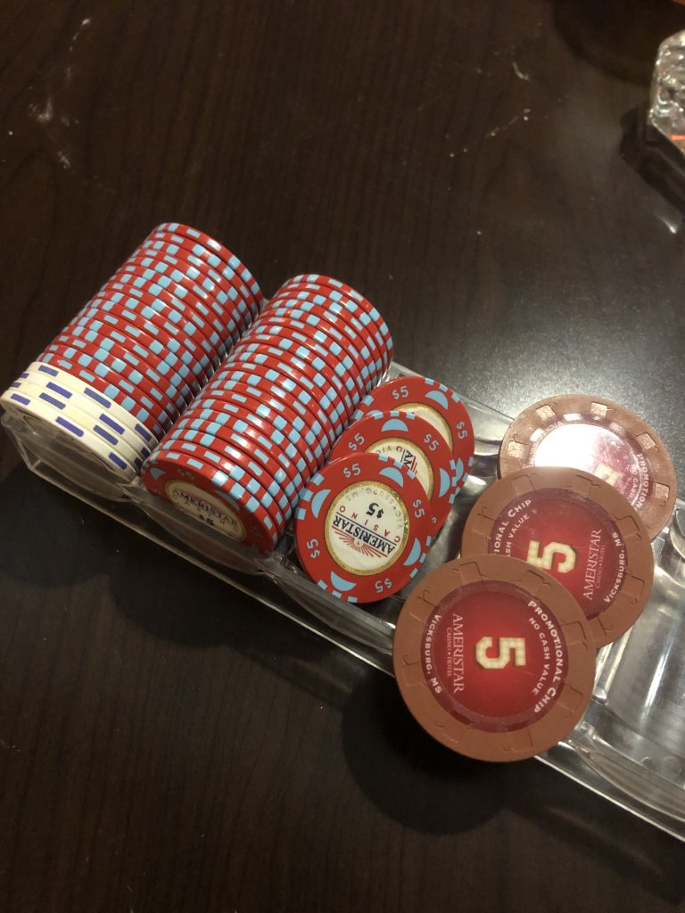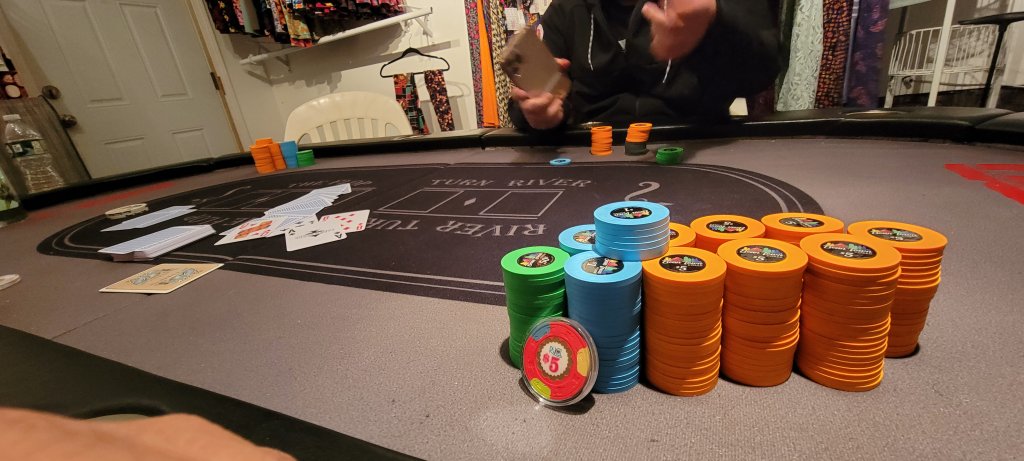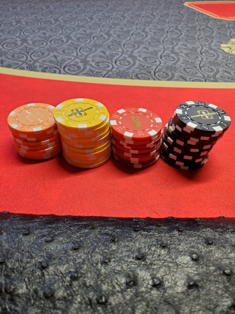 Interesting rail textureWife is playing at the only "legit" (BIG quotes there) poker room in GA. $125 entry, 4k gtd for 1st. Blinds 400/800, sitting on about 56k. Yes, they use stamped dice for their tournies. Or Nexgens.