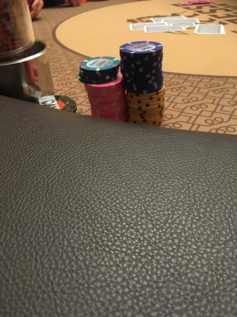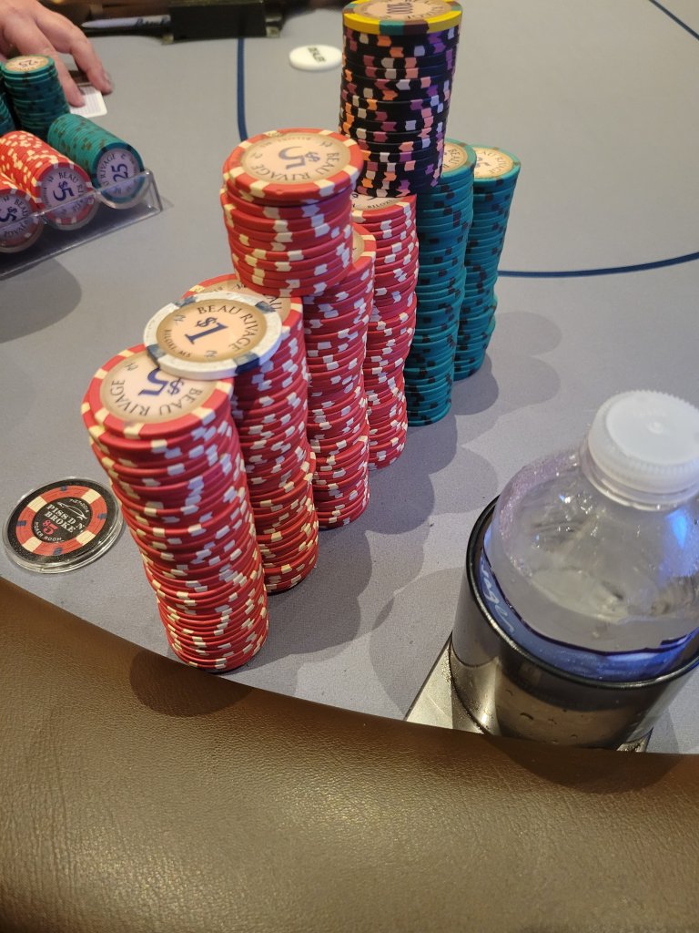 Y'all I'm so fucking mad right now. We had a really great game (obviously) where I'm running well and several large stacks in the 3-5k range including the bluffy loose guy from the 1/3 game earlier who has ran his stack from 1500 to around 4.5k. He called off 97o for a 350 all in earlier and made a wheel in a monster pot after it got 3 bet PF with 32o. Basically a dream especially since I was to the direct left of Mr Loose..... Everyone is friendly and happy, including the people that were losing because they were drinking heavily...
