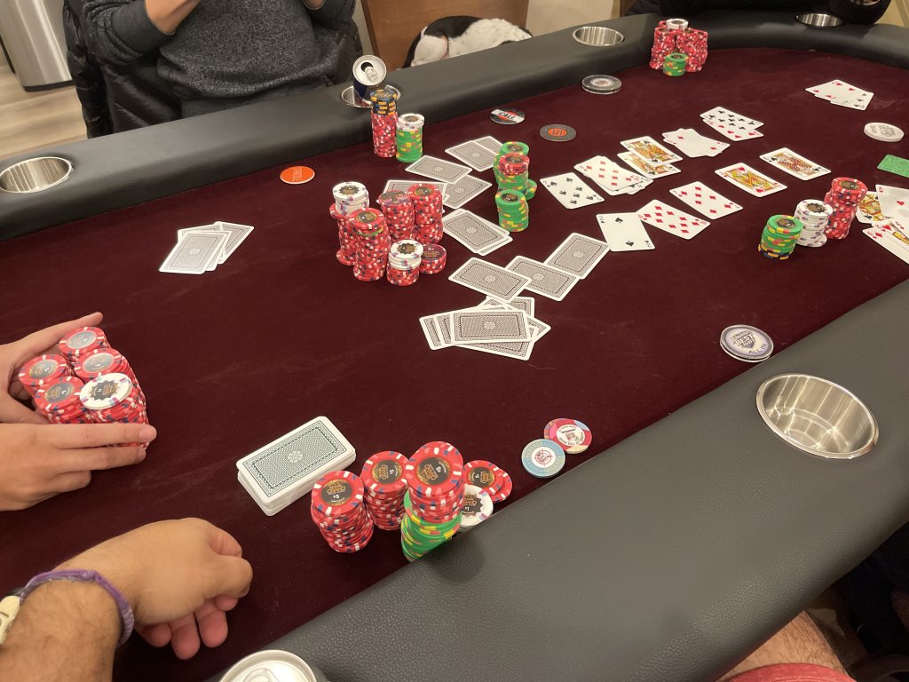 (Well, sorry. Drinking too much? I had dealt quads in hand and was potting blindly. I somehow lost the photo. I don’t know what’s happening. Here’s another picture of chips and drinking!)