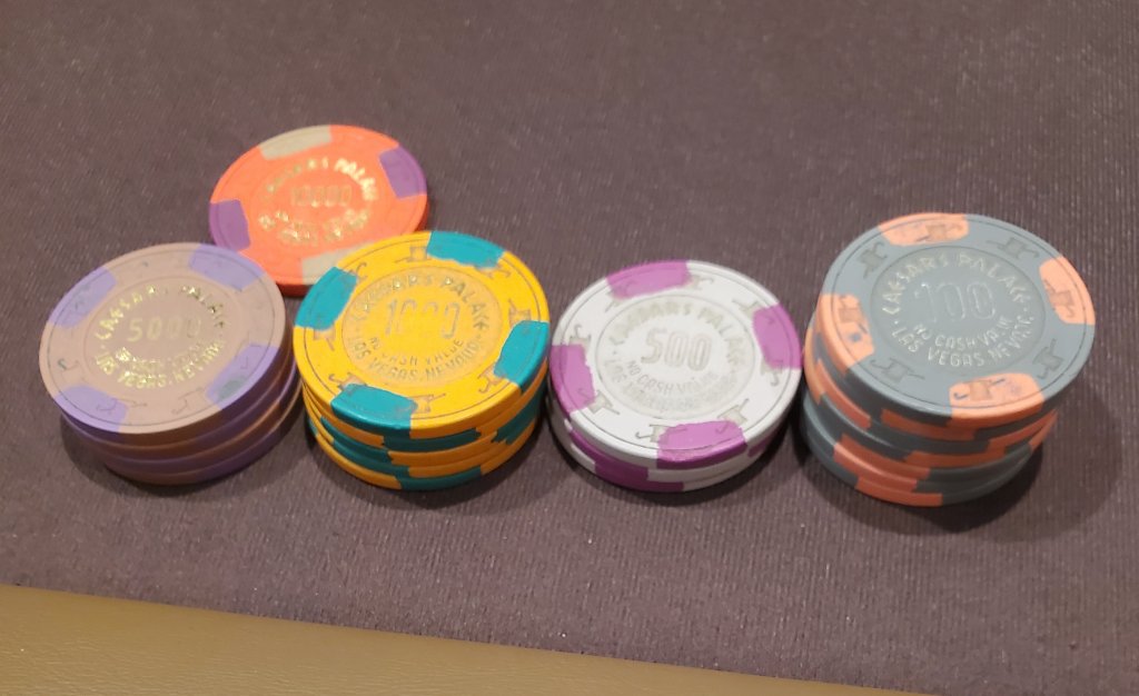 Beautiful chips but unacceptably dirty!Still in the tourney. And a $50 add on at the break gets you one T10,000 chip. Which is blaze orange!