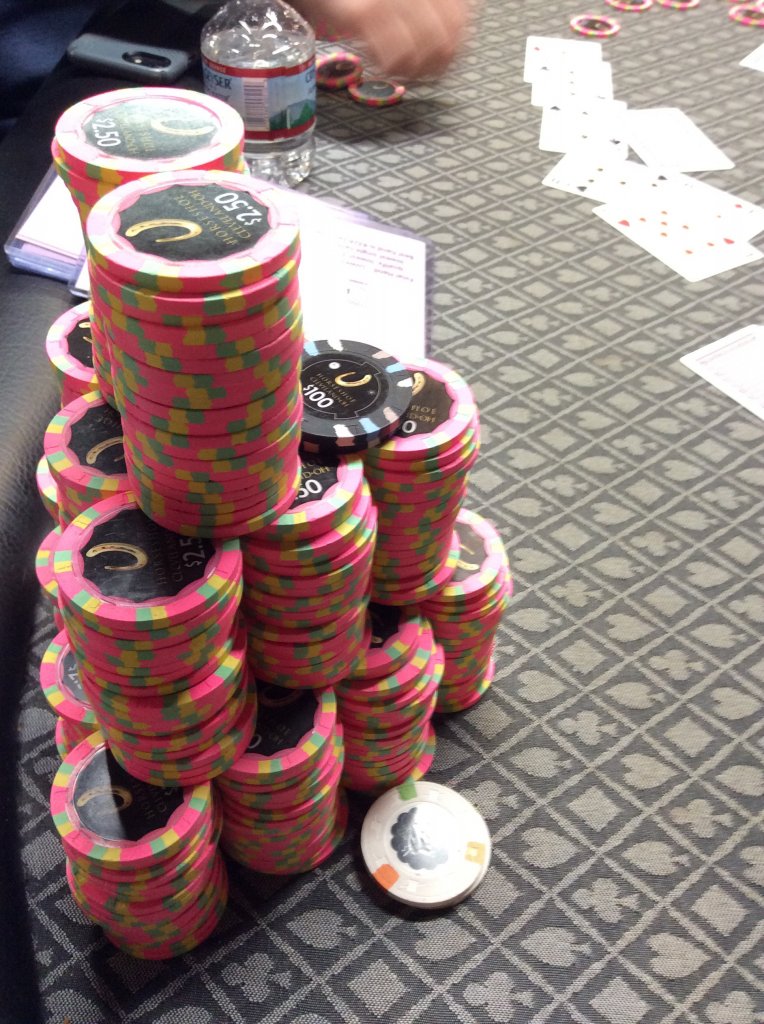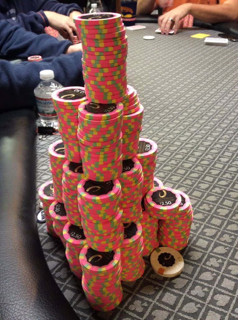 Pink chip game last weekend. In for $870, out for $1360. $2.50/5.00 structure but capped pre and flop almost every hand.
