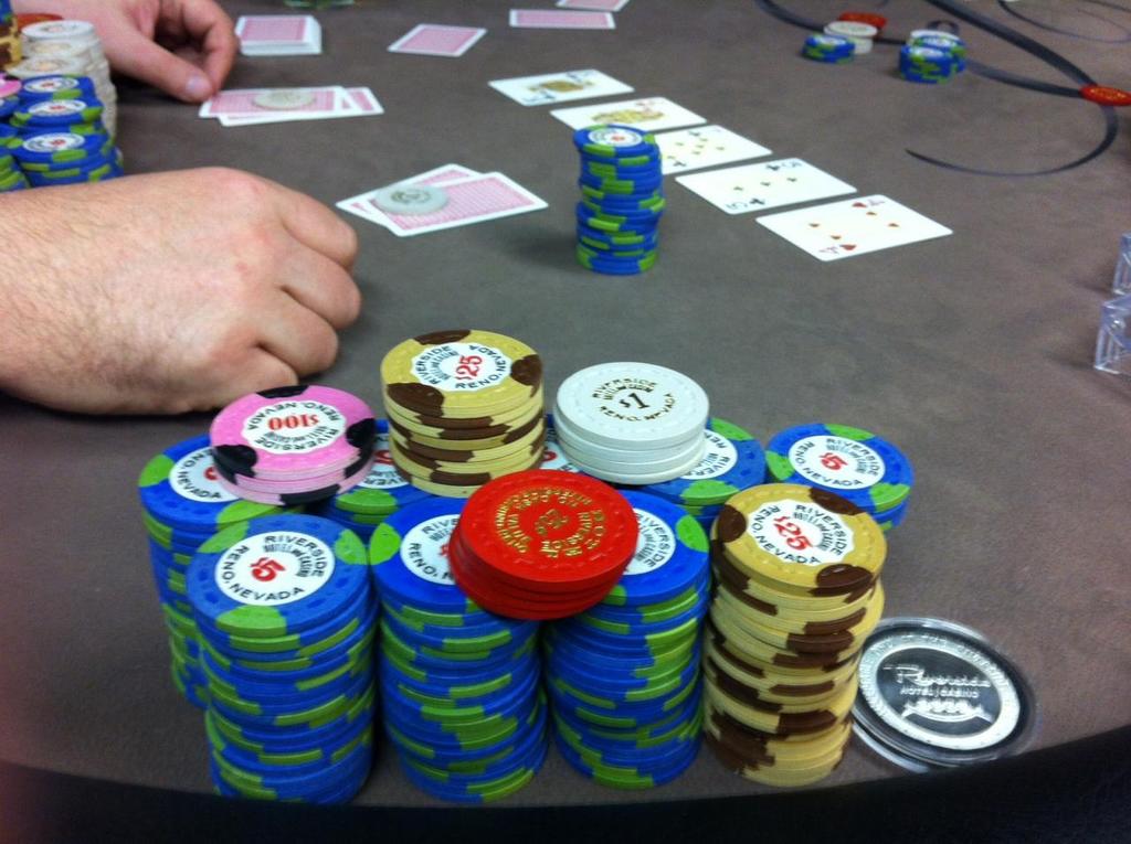 Since most of the posts/links/pix on the old blue interface are ass-over-teakettle, here is the net result of my run-good the very first time we put my Riversides in play, at Bergs' .25/.50 (yes, 25 cent, 50 cent!) circus table about a year ago. In the background, a typical modest river bet by Bergs in a SOHE hand.