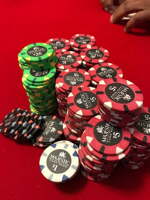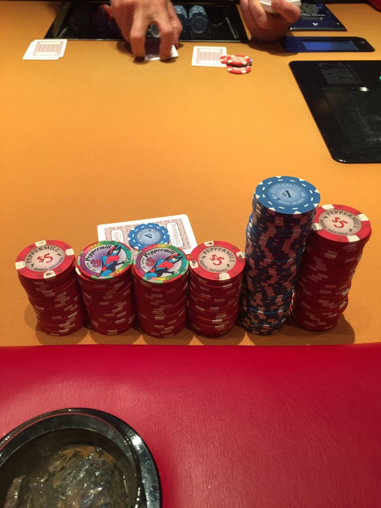 I was playing a long 1/2 session in Charles Town, VA here. Had about ten buy-ins in this pic. A good session! But the best part is I specialize way more in Omaha 8 or better and for the first time I've ever seen, a 25/50 limit o8 game opened up with 4 guys super early in the morning (you can see how dead it is behind me). I took my ten 1/2 buy-ins and sat in the game, had the nuts twice in about 20 hands and made about $900 total in the not-really-even-a-session. Then I chickened out and went back to the 1/2 game with a bunch of greens to shuffle :).