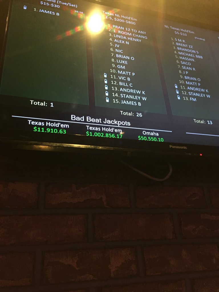 Bad beat at MCC right now is north of 900k, so its full round the clock. They expanded the room by removing slots and having people play in the middle of the casino floor. Its miserable. I won't go back until after it hits.Nice. Sounds like they are trying to compete with MCC... and winning.