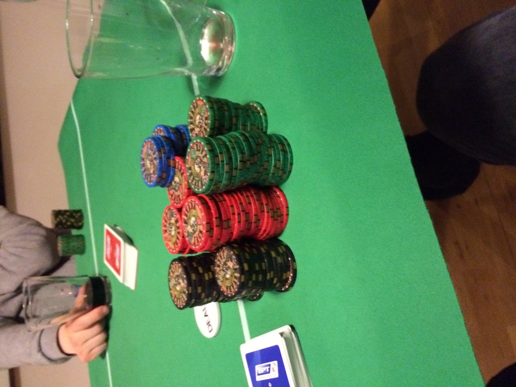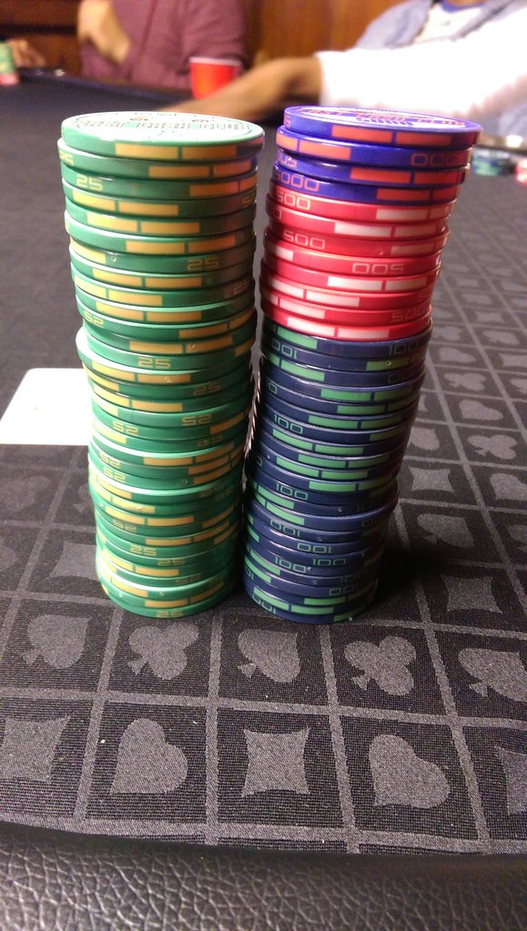 From last night's game. 5/5 blinds and 5 to go. Typical buy-in last night was $800 - $1000. I only bought in for $600 but managed to run it up to $3,460 at the end of the night.