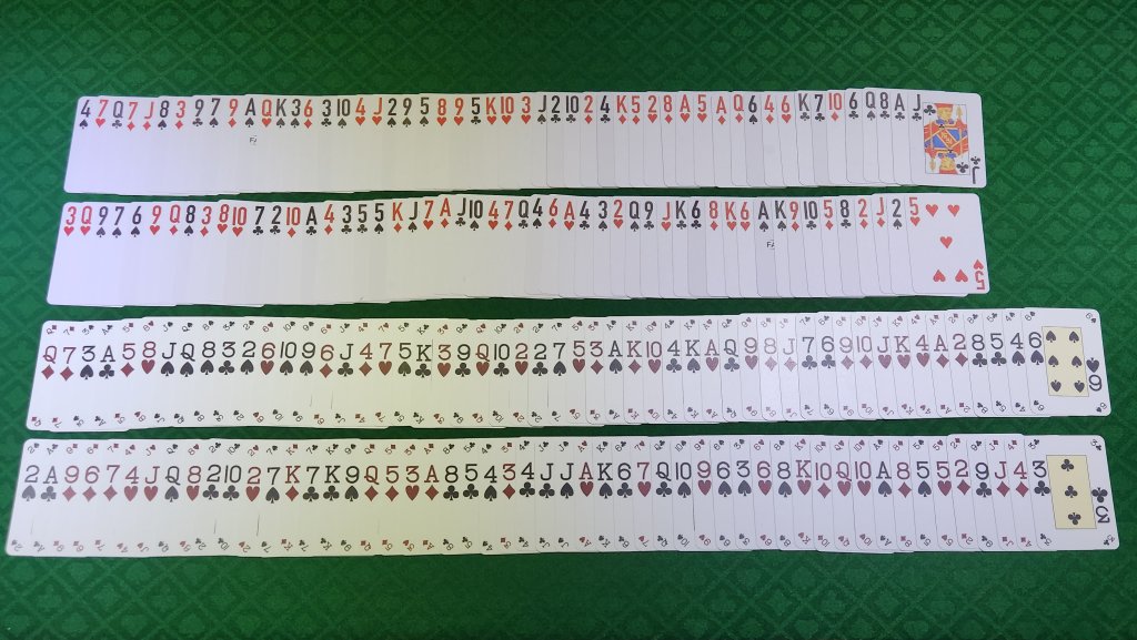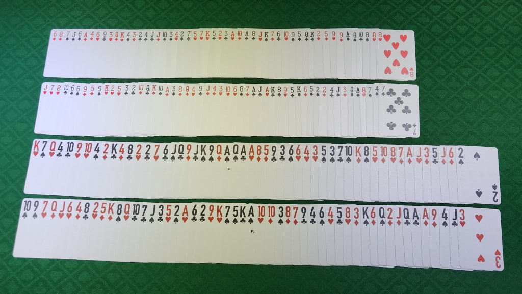 Last week I conducted a small sample size experiment: I took 16.decks by 7 different brands, sorted A-K♠️, A-K♥️, A-K♦️ & A-K♣️. Didn't wash & inserted decks with the 7 shuffle mode selected then removed & didn't cut after to see how effective it was at just randomizing the decks. Here were my results: