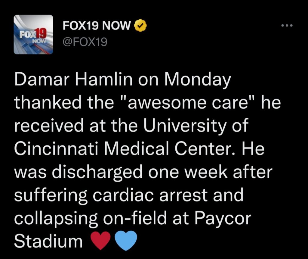 Never thought I’d be saying this as a Pats fan, but Let’s Go Bills!!!Damar Hamlin. Back home where he belongs. View attachment 1055582