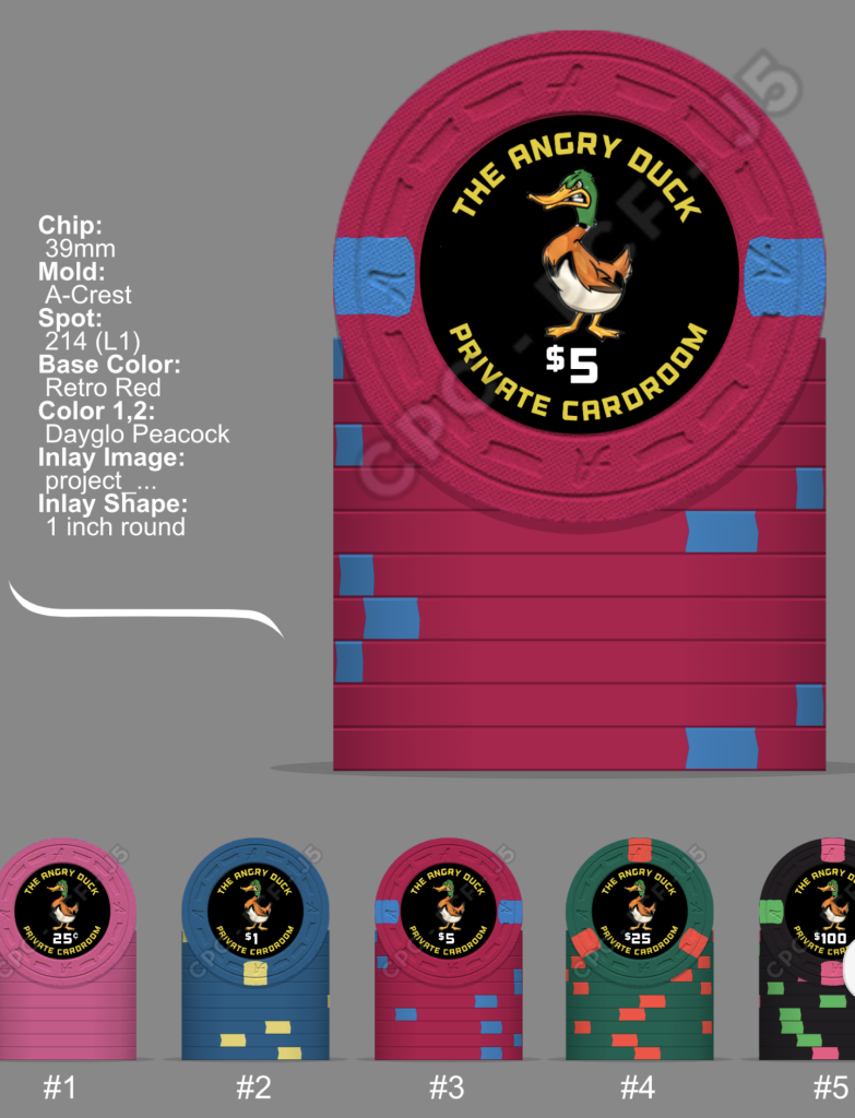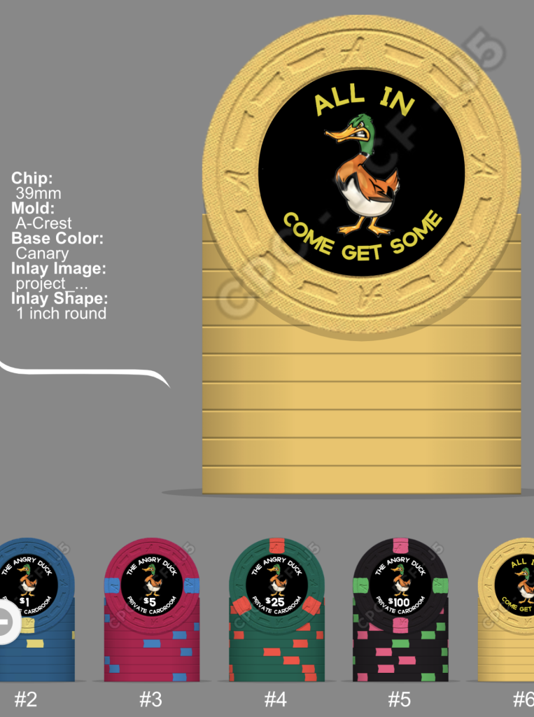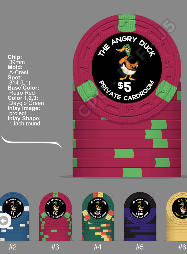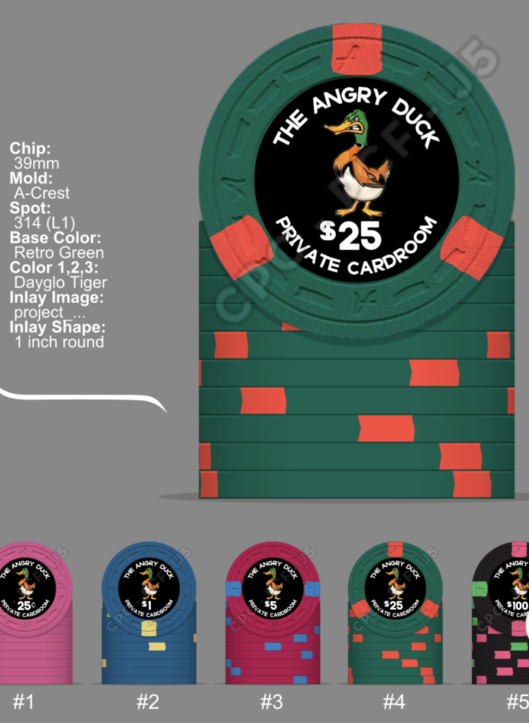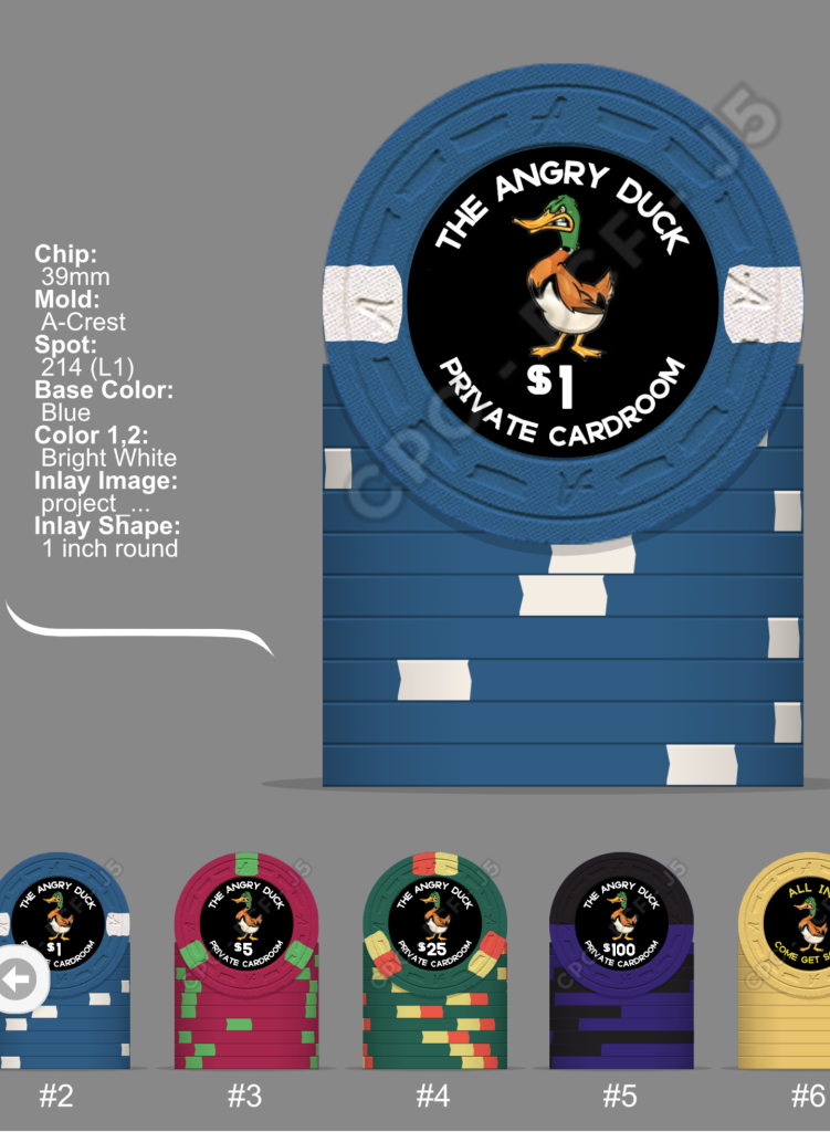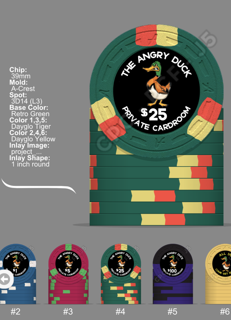 Made the white text larger to prevent edge bleed. Moved it away from the edge enough I believe. Made the duck a lighter color so it would show better. Made the denomination symbols smaller. Changed some text. Changed a few chip colors as well. I printed it out the size of a regular chip and it is readable at arms length or even further