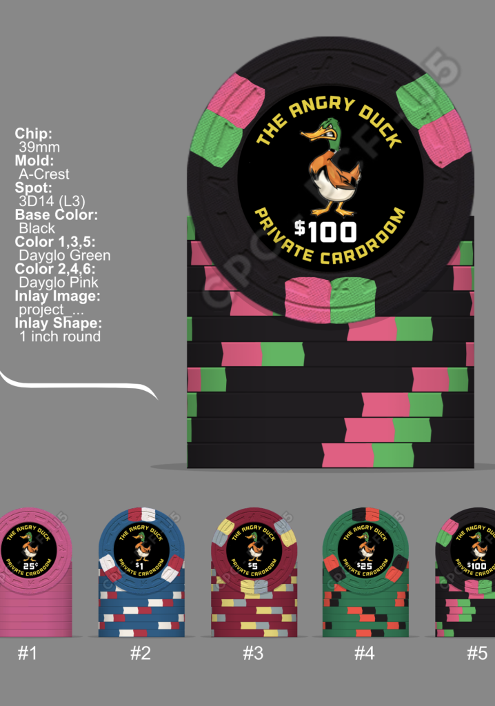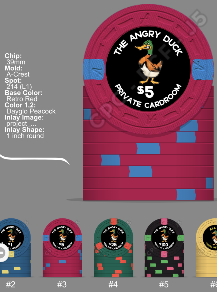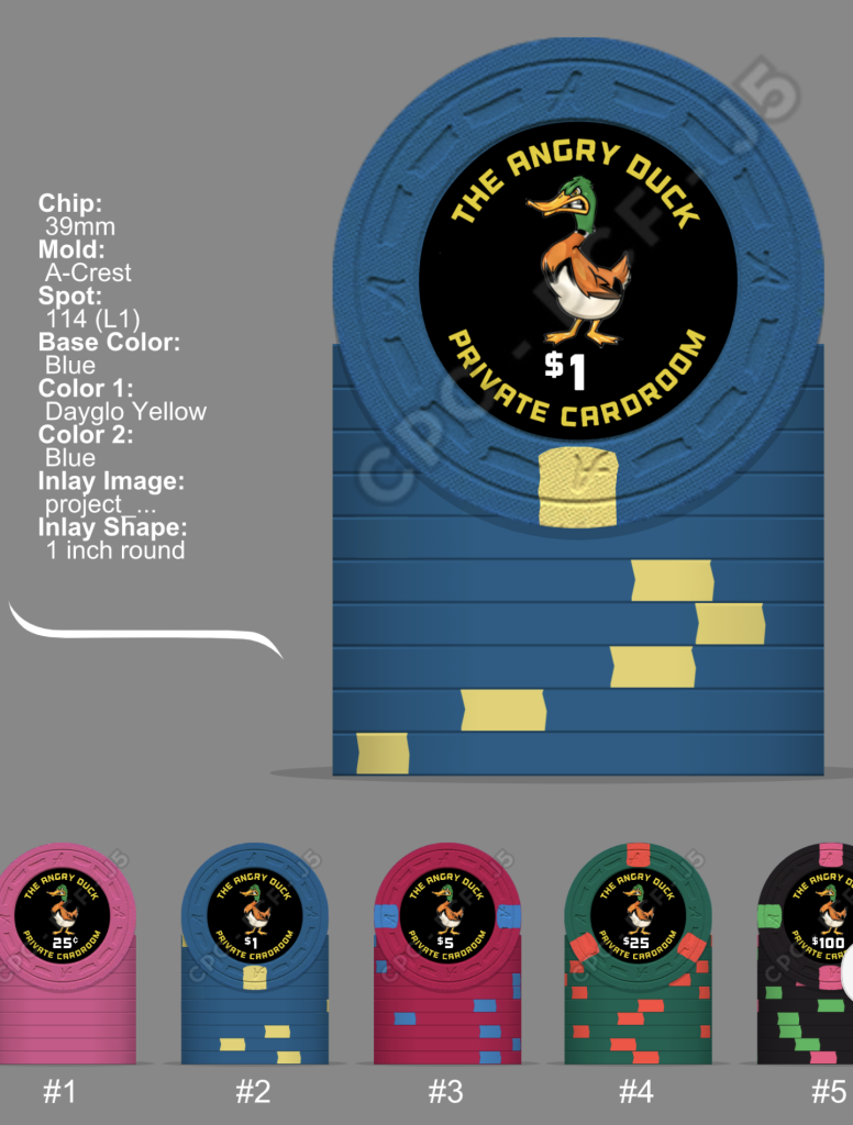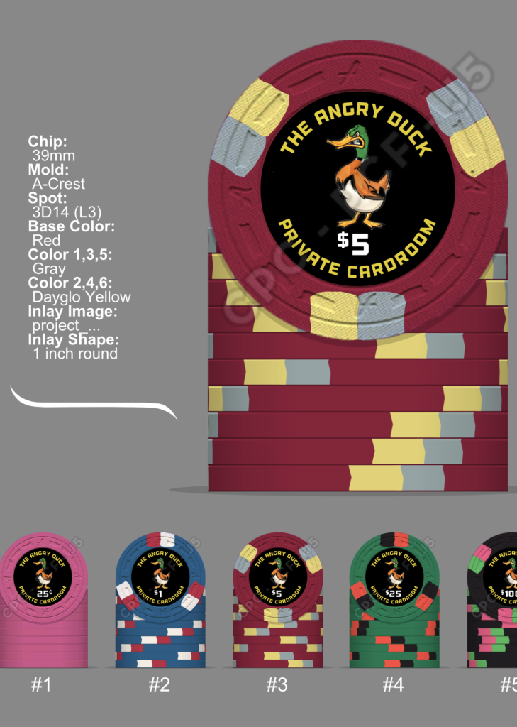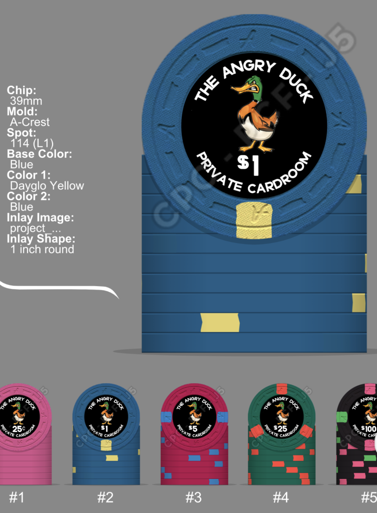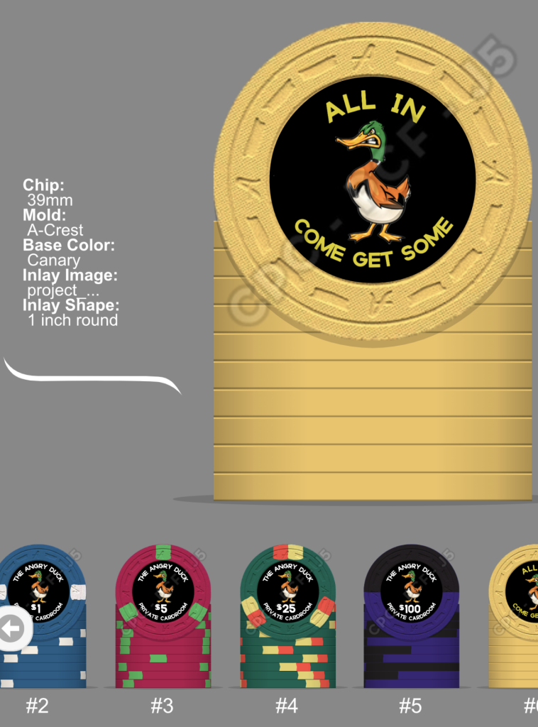 Made the white text larger to prevent edge bleed. Moved it away from the edge enough I believe. Made the duck a lighter color so it would show better. Made the denomination symbols smaller. Changed some text. Changed a few chip colors as well. I printed it out the size of a regular chip and it is readable at arms length or even further