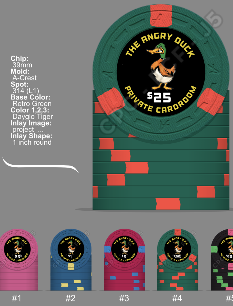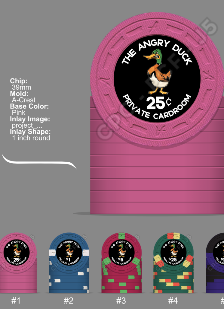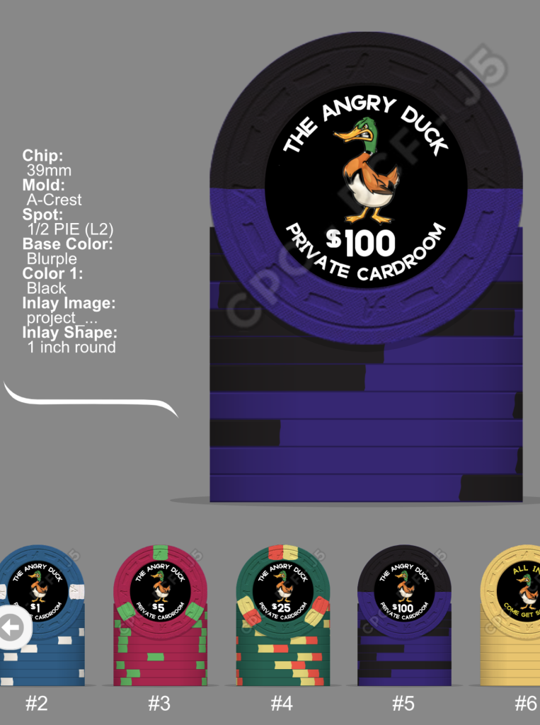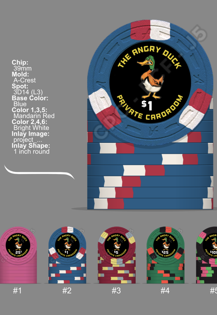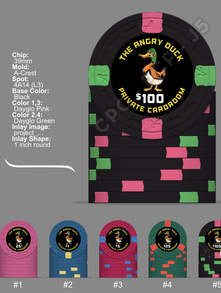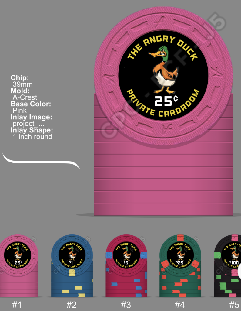 Made the white text larger to prevent edge bleed. Moved it away from the edge enough I believe. Made the duck a lighter color so it would show better. Made the denomination symbols smaller. Changed some text. Changed a few chip colors as well. I printed it out the size of a regular chip and it is readable at arms length or even further