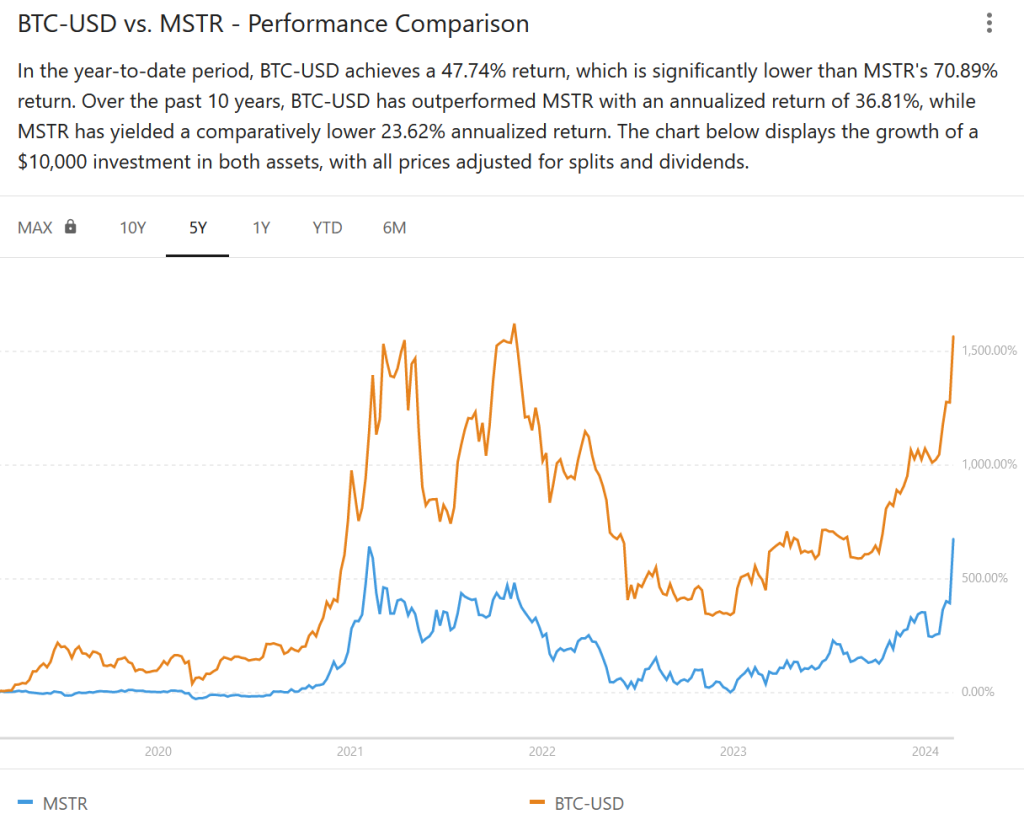 I looked up a comparison chart between MSTR and BTC prices, it's been pretty crazy! Very little data after the BTC ETFs launched, but so far I don't think they have dampened MSTR's returns much, if at all.A few years ago I placed a sizeable bet that MSTR - Microstrategy Inc. Would serve me as a good stock vehicle to indirectly profit from the BTC they have acquired. The last few weeks have been amazing. How far it runs I'm not sure anyone can tell.