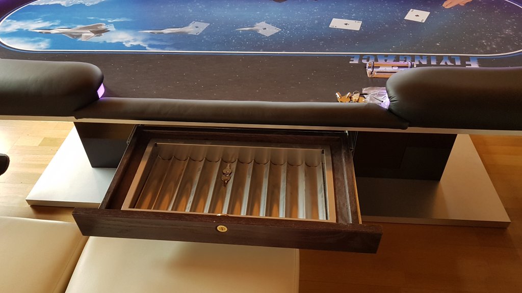 I’m a bit late, but this table is absolutely stunning. The retractable dealer tray is a genius idea, I never thought of that possible. It frees so much space, making the dealer able to play as well if desired