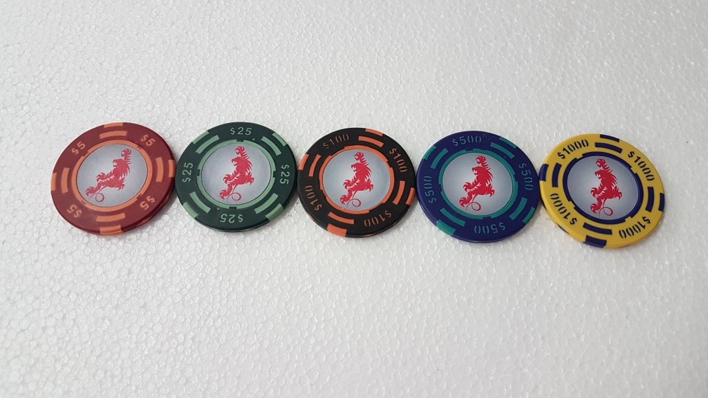Different sides for each chip. No denoms on the labels because the chips already have them around the edges.