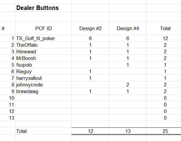 I would be happy with any of the designs but the 4th and 3rd are my favorites in that order. Count me in for one please. Whichever design you choose I would be happy to have one! They look great!!!!FYI, I don't mind having extras made for anyone who might want one. So let me know in your comments which one you like best, and if you would be willing to buy. Not sure the cost yet, but these will be the standard 60mm ceramic buttons from BR Pro Poker.