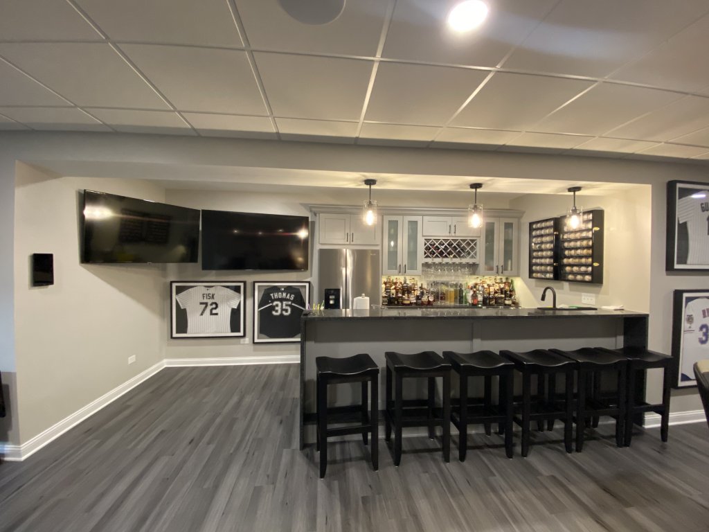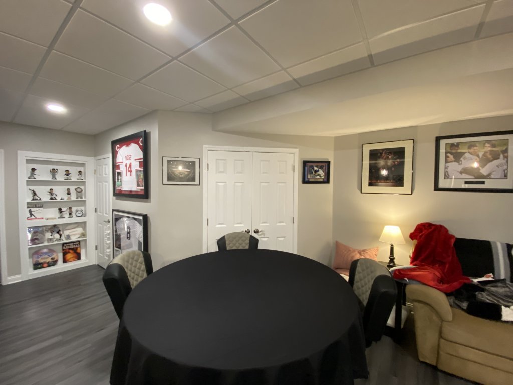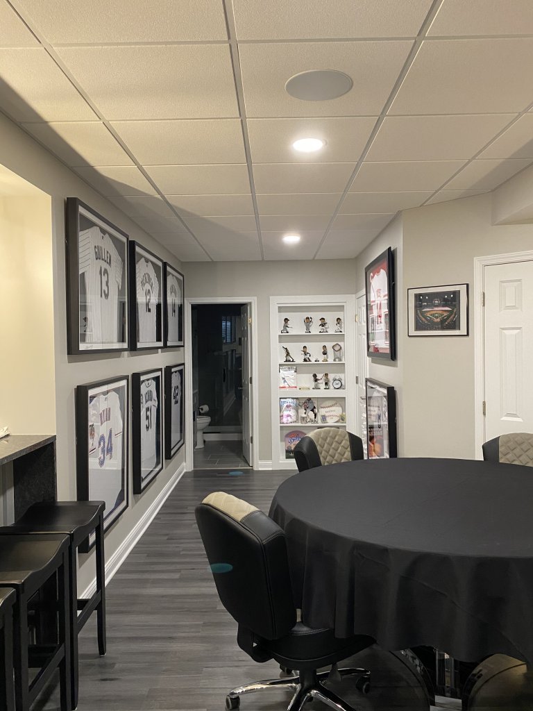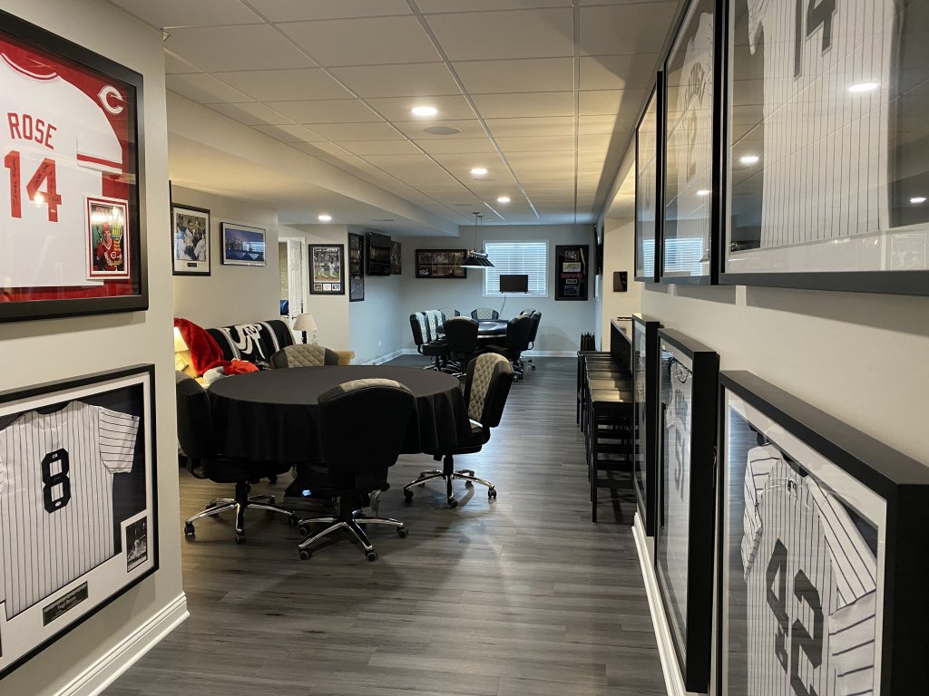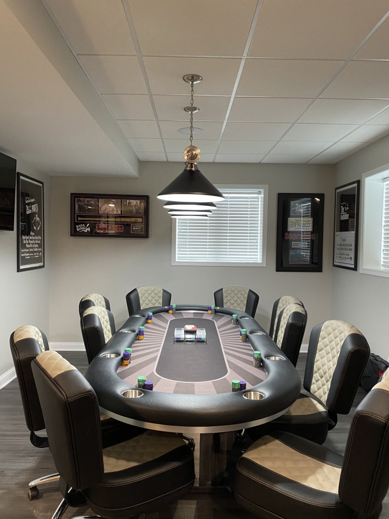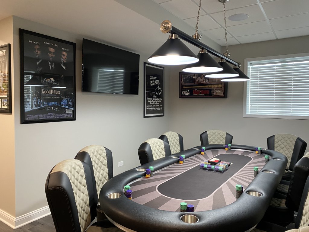Love the shot showing both tables in the same room! I thought maybe the oval was in a smaller room and now I see the layout! Everything looks amazing, but man those 2 TVs side by side and not the same size would tilt me a bit!! What a man cave brother!!